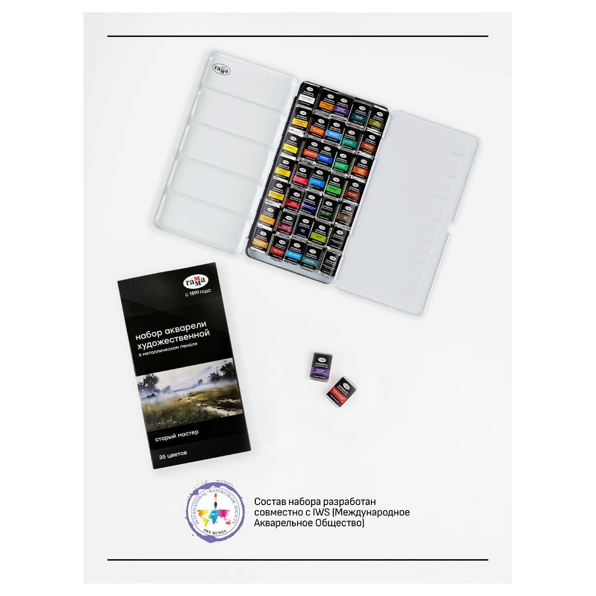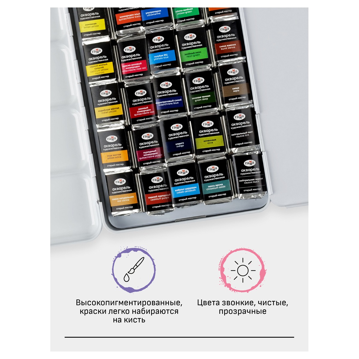 Акварельные краски профессиональной серии "Старый мастер" разработаны в собственной исследовательской лаборатории завода. Краски изготовлены на основе органических и неорганических пигментов и гуммиарабика высшего качества. Цвета акварельных красок звонкие, чистые, прозрачные. Краски высокопигментированные, интенсивные, легко набираются на кисть. Маркировка светостойкости, колор-индекса и укрывистисти указана на упаковке.