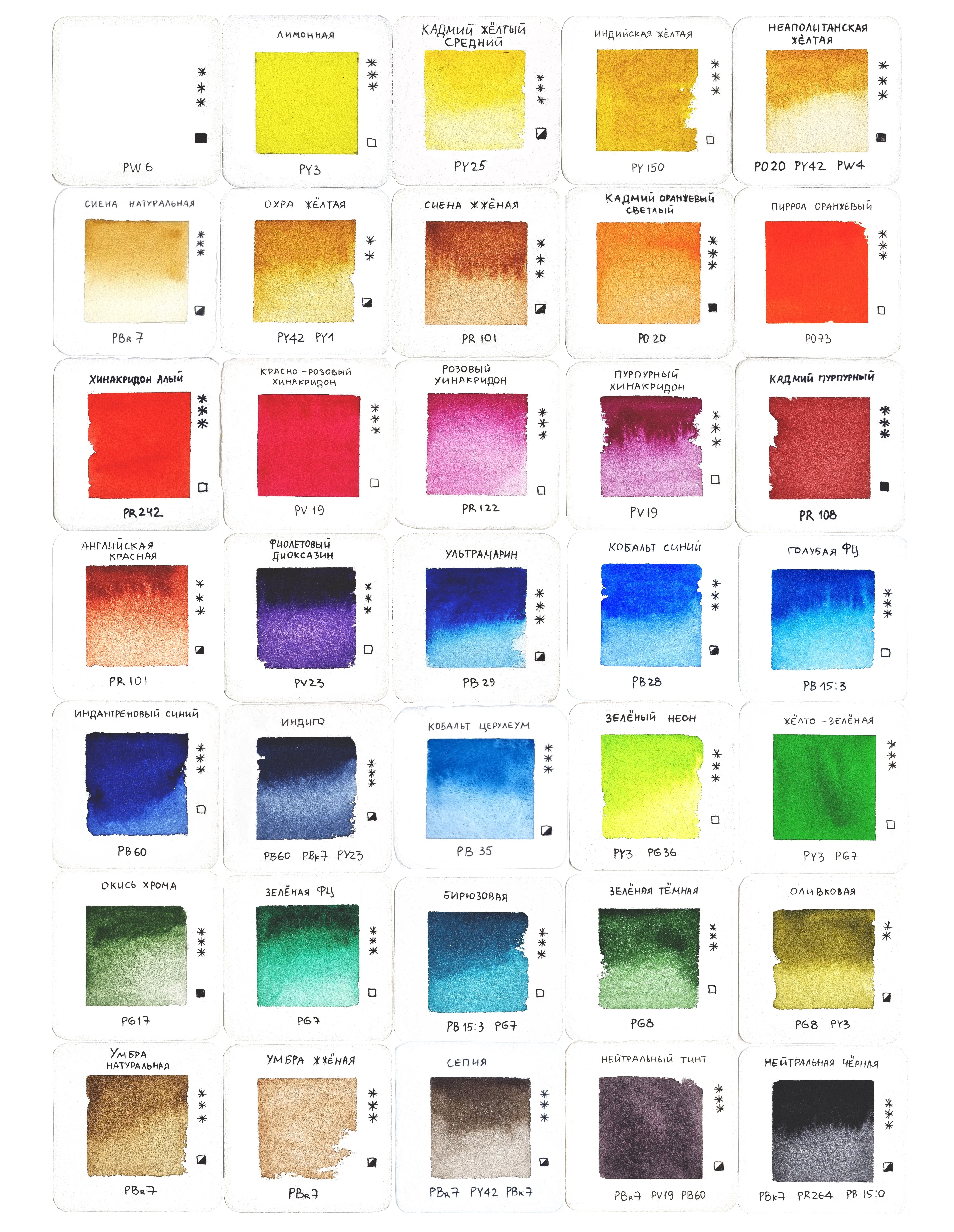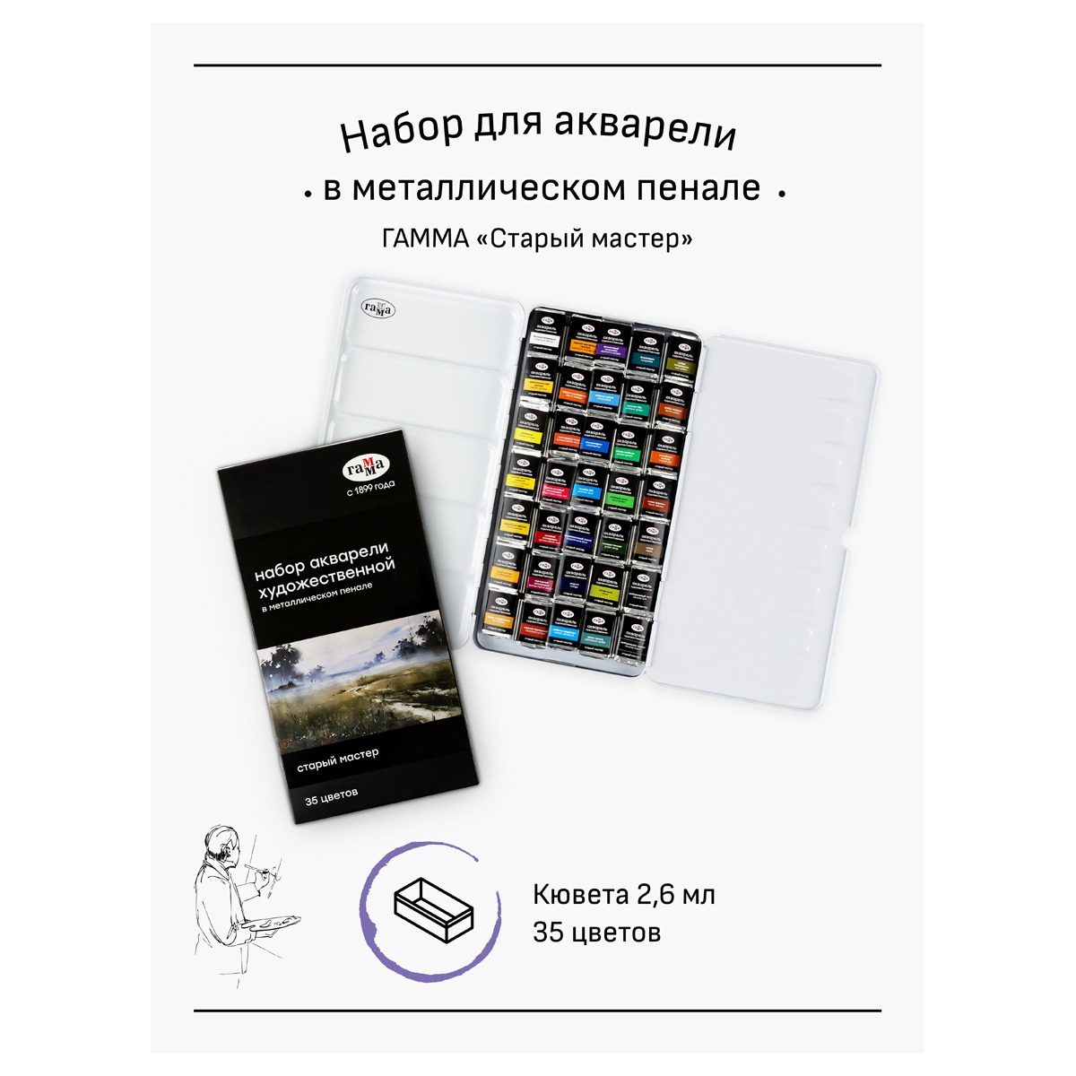 Акварельные краски продаются в наборе 35 шт в кюветах 2,6 мл.