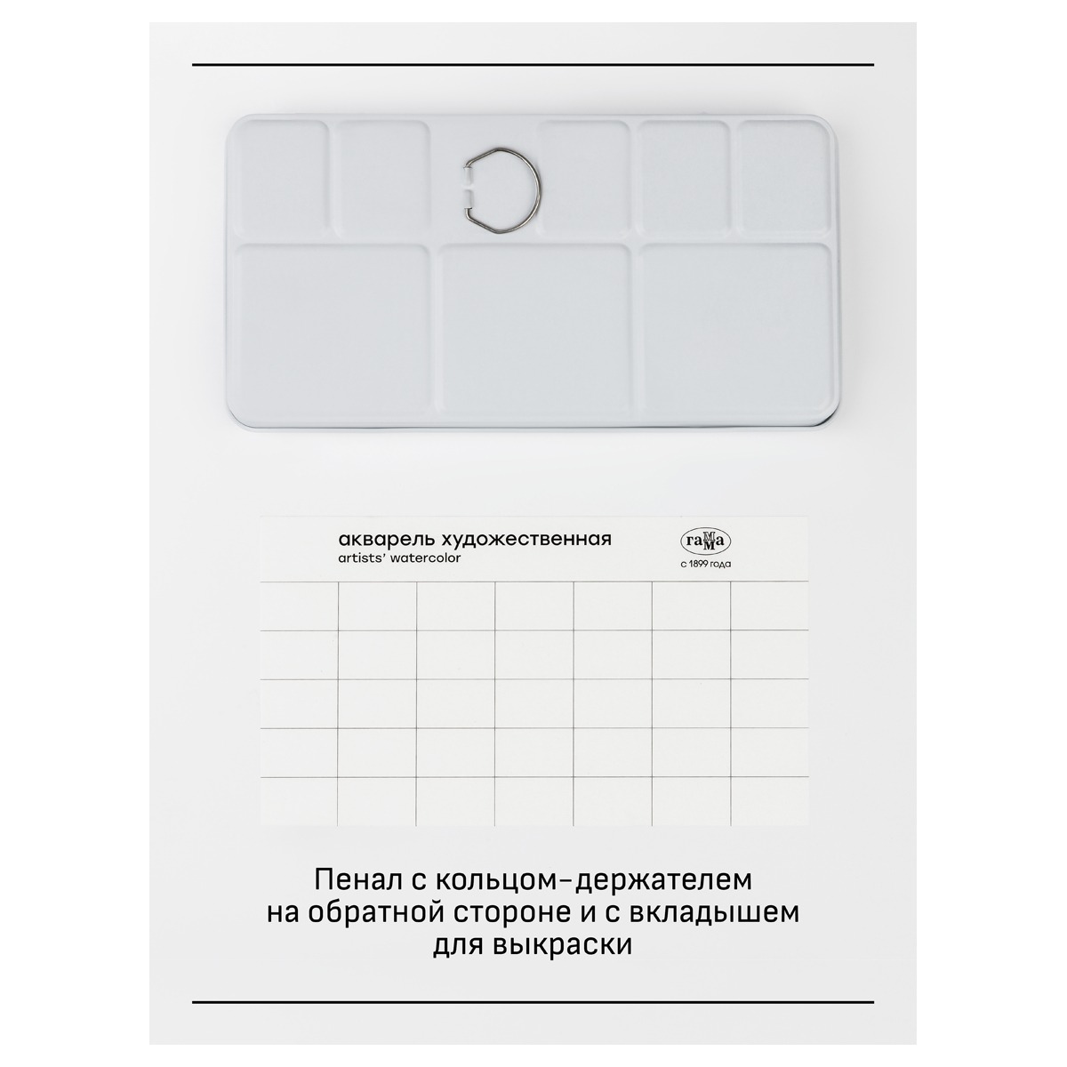 Набор в металлическом пенале с удобными креплениями кювет, палитрой и кольцом-держателем на обратной стороне.