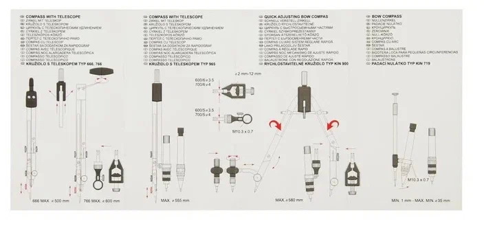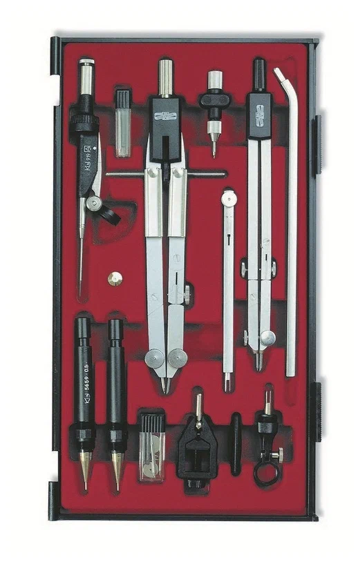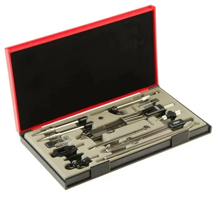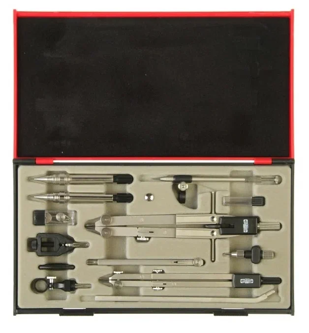 Чертежный набор профессиональный (готовальня, 13 предметов) футляр пластик. (циркуль с регулировкой, циркуль 2 карандаша мех. вставка, запасные детали+грифели+иглы, переходник резьбовой для изографа/рапидографа, переходник универсальный, 2 удлинителя, кронциркуль)