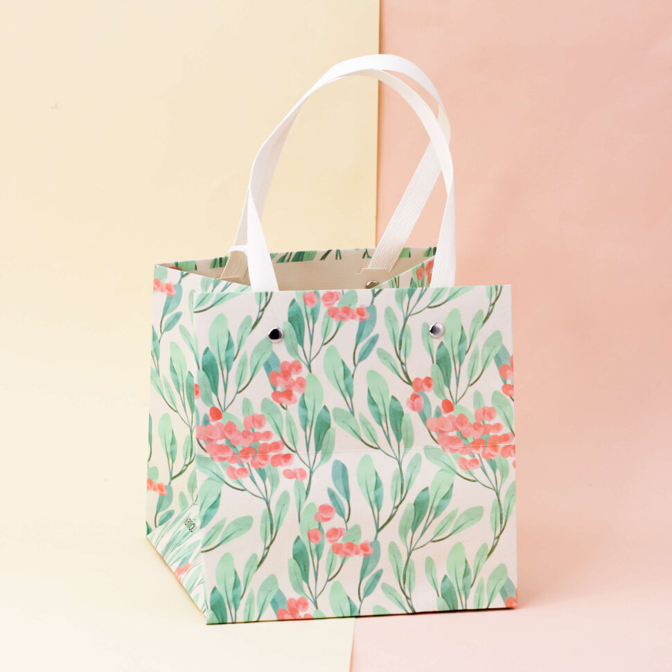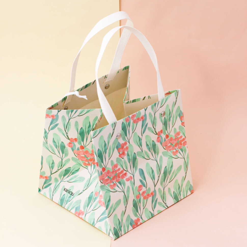 Подарочные пакеты выполнены из дизайнерского, плотного картона с выраженной фактурой, а так же с нанесением яркого дизайнерского принта. Ручки подарочного пакета плоские из плотной плетённой бумаги, пропитанной экологичным клеевым составом. Ручки надежно прикреплены к пакету на металлические заклёпки. На ручках пакета так же располагаются бумажные бирки, которые служат в качестве небольшой подарочной открытки или ярлыка. Дно усиленно специальной картонной подложной. Размер: 16х16х16 см.