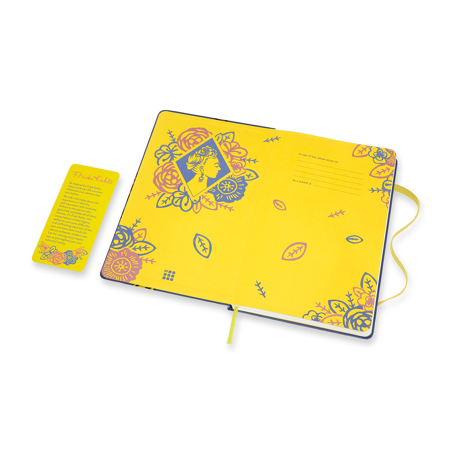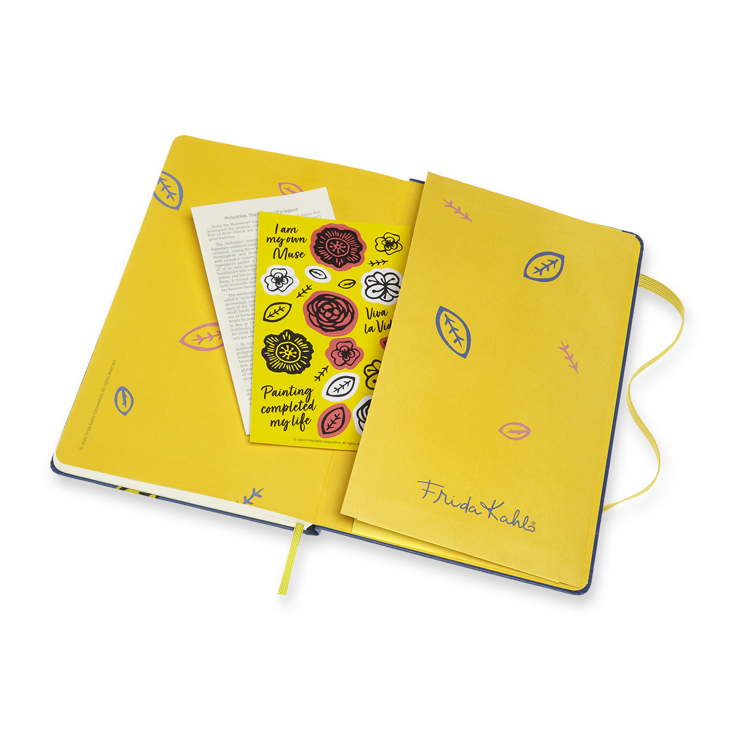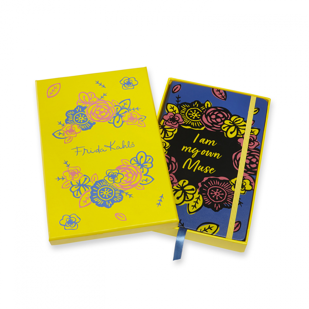 Для тех, кто ценит и любит творчество Фриды Кало, Moleskine приготовил превосходный, действительно уникальный подарок – коллекционный набор ограниченной серии. В продажу поступили только 9999 пронумерованных экземпляров. Ярко-желтая коробка украшена стилизованной графикой, напоминающей культовый цветочный головной убор Фриды Кало. Сама записная книжка представлена в обложке синего цвета с изображением грациозных цветов и листьев, солнечно-желтой эластичной застежкой и одной из самых незабываемых и вдохновляющих цитат Кало: «Я – своя собственная муза».