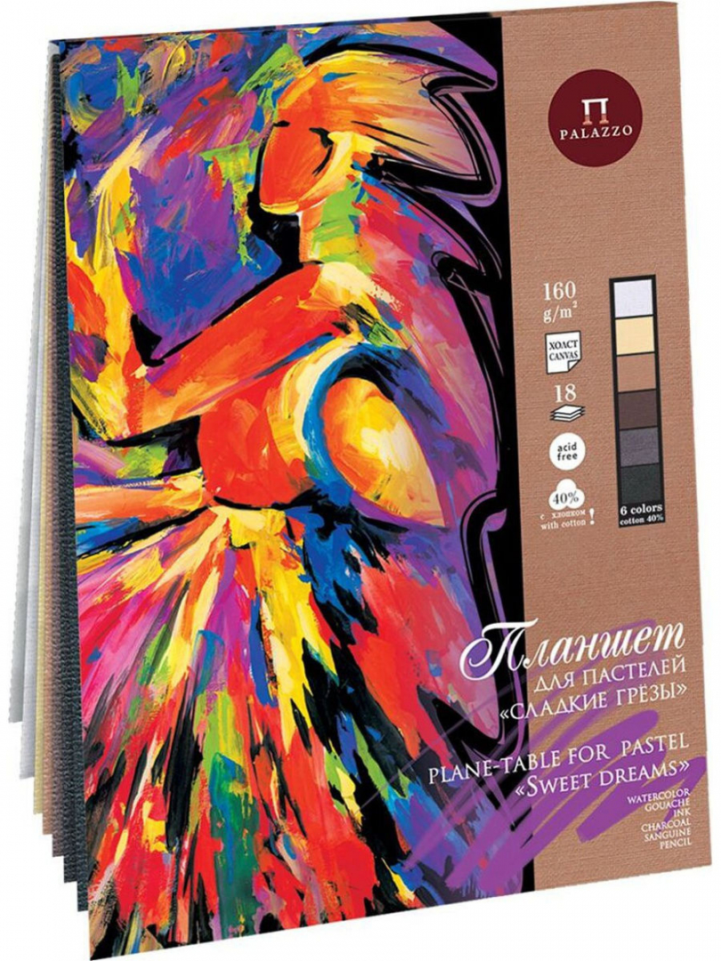 Планшет состоит из 18 листов и 6 цветов пастельной бумаги с жесткой подложкой из переплетного картона.