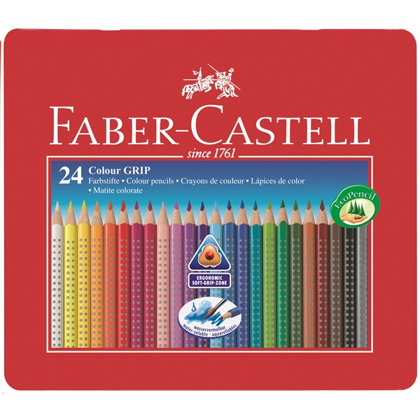 Набор цветных карандашей Grip от производителя Faber-Castell.Могут использоваться как простые и акварельные карандаши.Карандаши имеют узнаваемый запатентованный дизайн Grip и покрыты противоскользящими шашечками.Благодаря специальной технологии проклеивания грифеля (SV), грифель не ломается при падении и затачивании.
