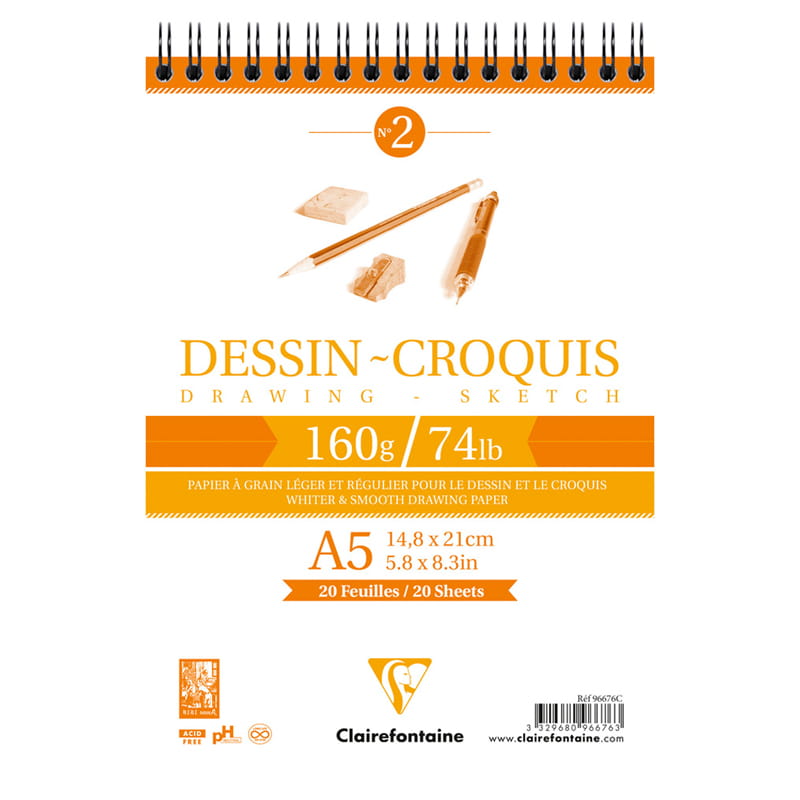 Блокнот для эскизов и зарисовок "Dessin croquis" от французского производителя Clairefontaine имеет внутренний блок белого цвета с плотностью 160 г/м2. Плотная бумага с гладкой поверхностью позволяет выполнять зарисовки карандашом, углем, ручкой, сангиной или фломастерами. Подходит для черчения и рисования гуашью или акварелью. Формат – А5. Вид скрепления – гребень.
