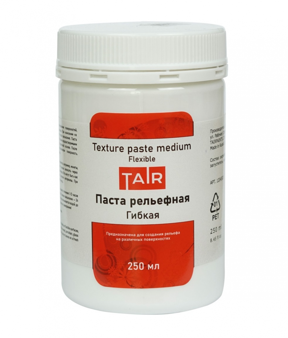 После высыхания гибкая паста имеет гладкую «пластиковую» поверхность и обладает умеренной пластичностью. Её можно смело использовать на гибких поверхностях (например, для работ на холсте, текстиле или коже), не опасаясь растрескивания.