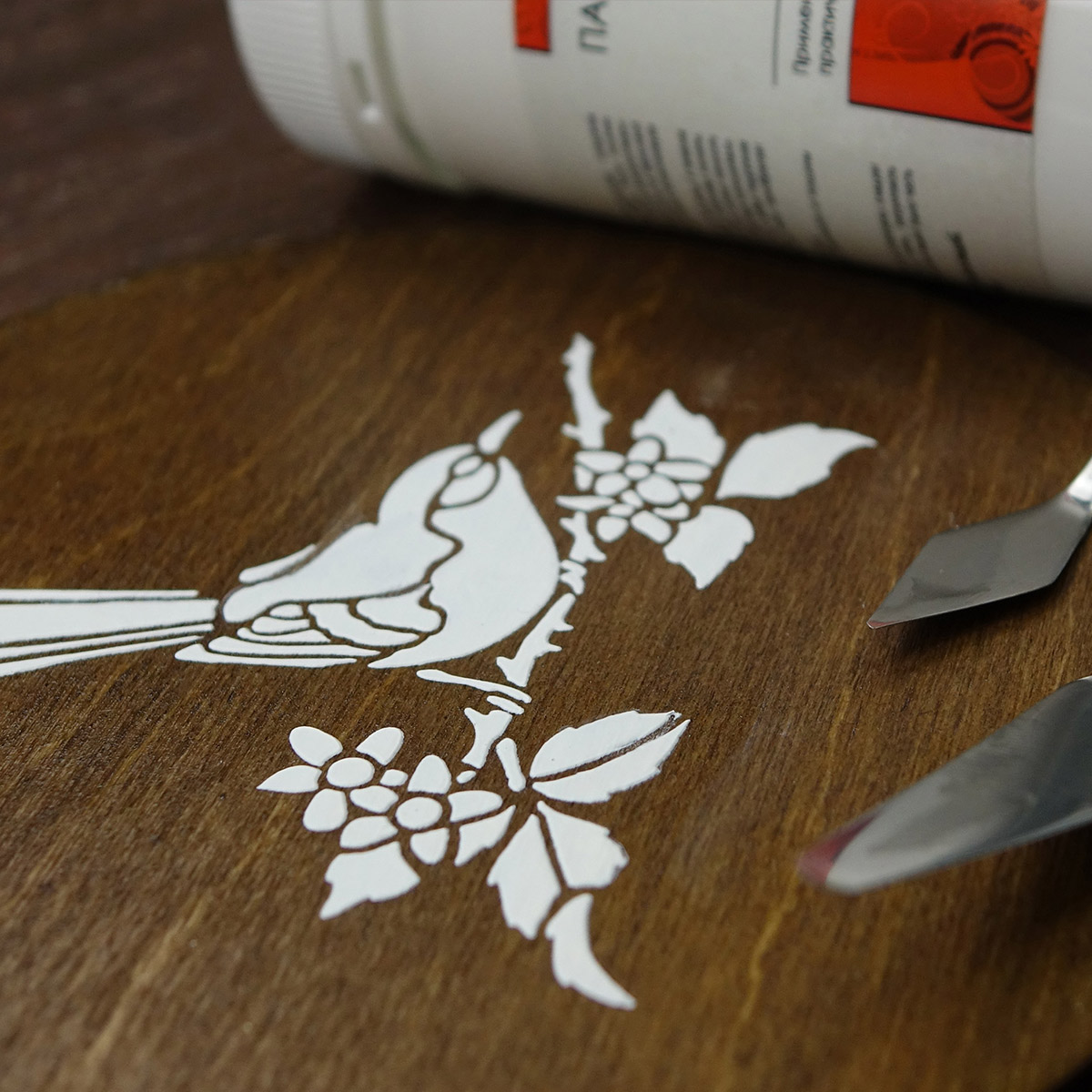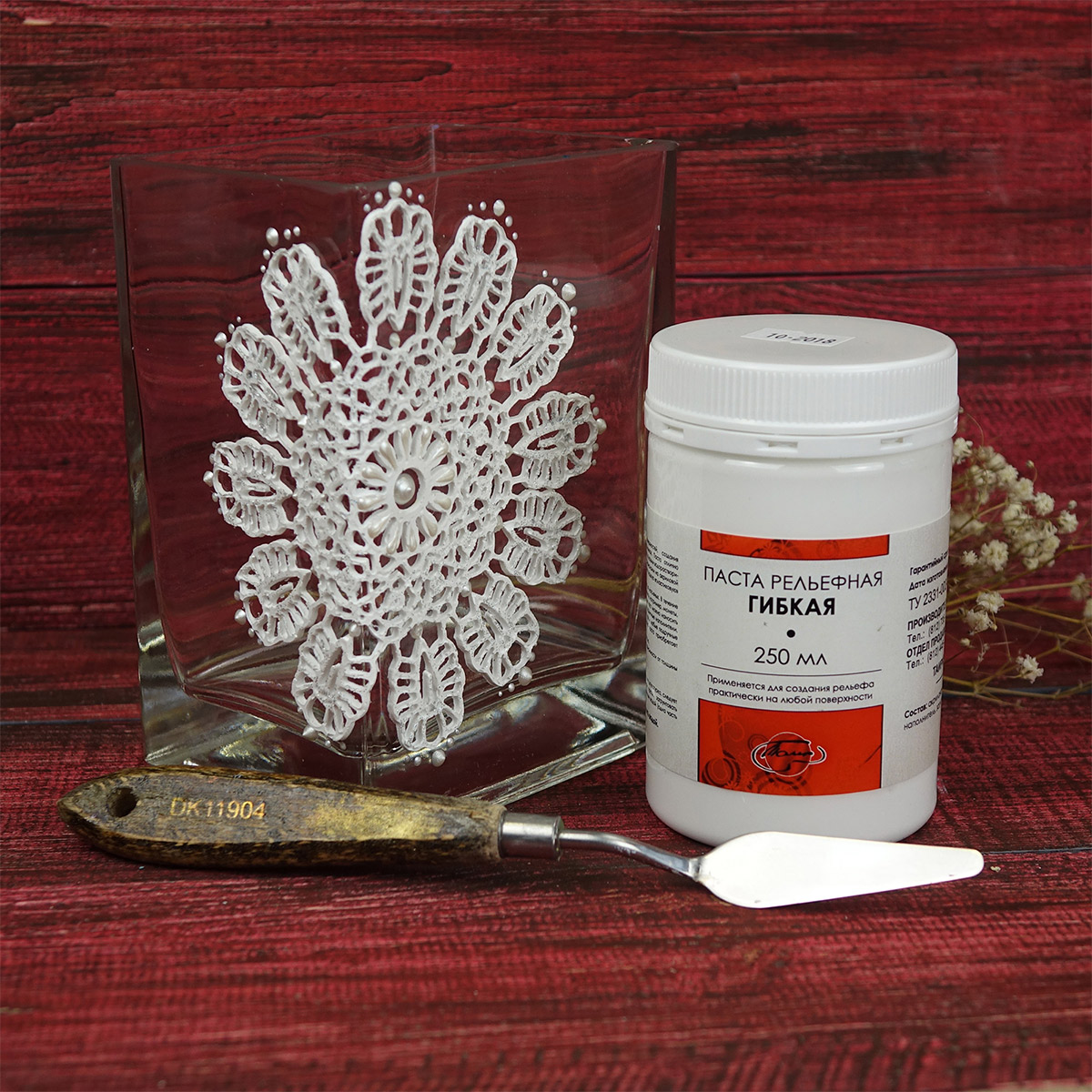 Пасту используют для нанесения через трафарет и в свободной технике.