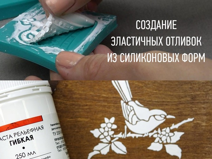 Также можно применять пасту для создания эластичных отливок из силиконовых форм, для их последующего использования в декоре. При работе с формами стоит учитывать, что в процессе высыхания паста даёт усадку и форму необходимо будет наполнять два или три раза.