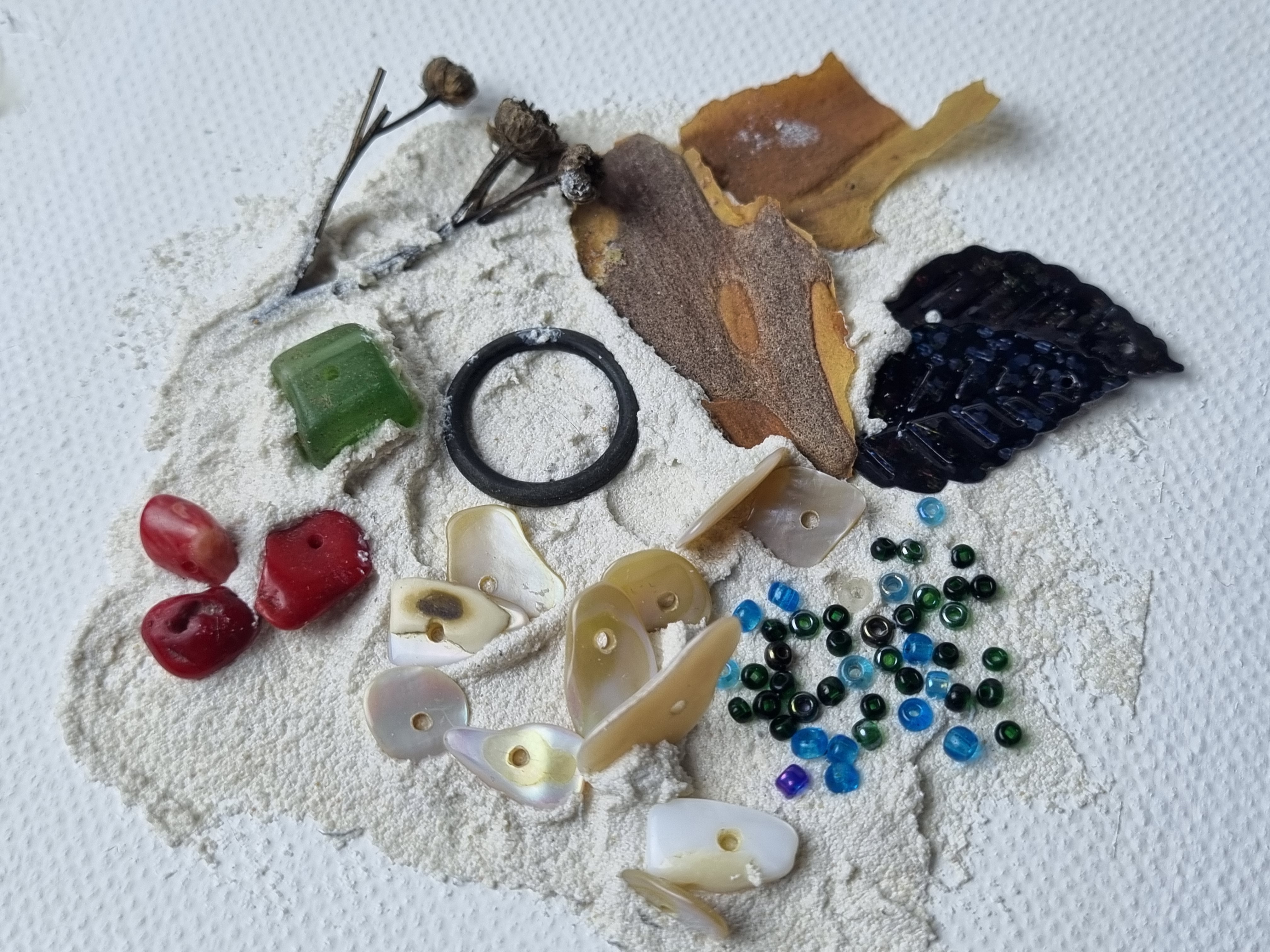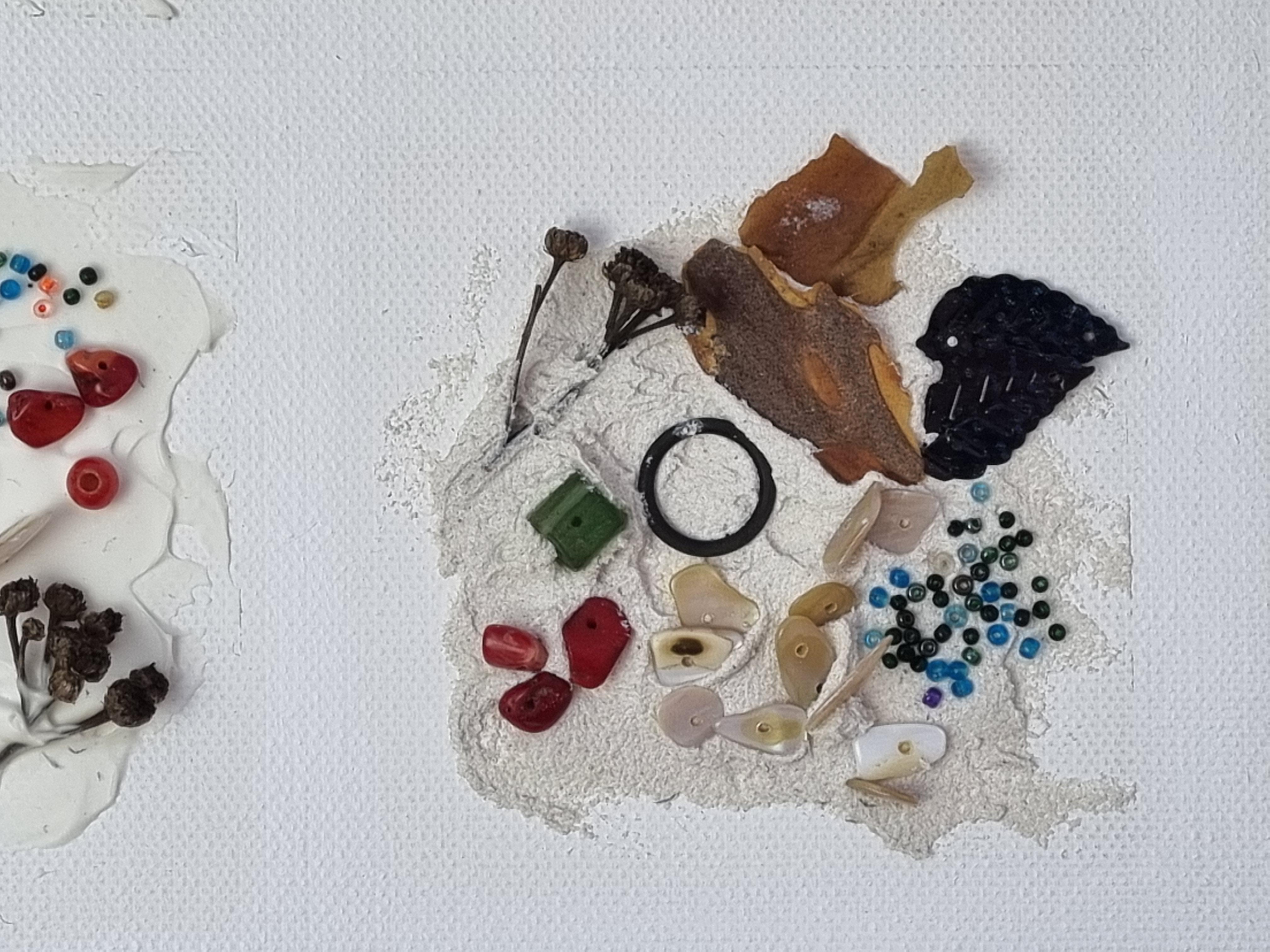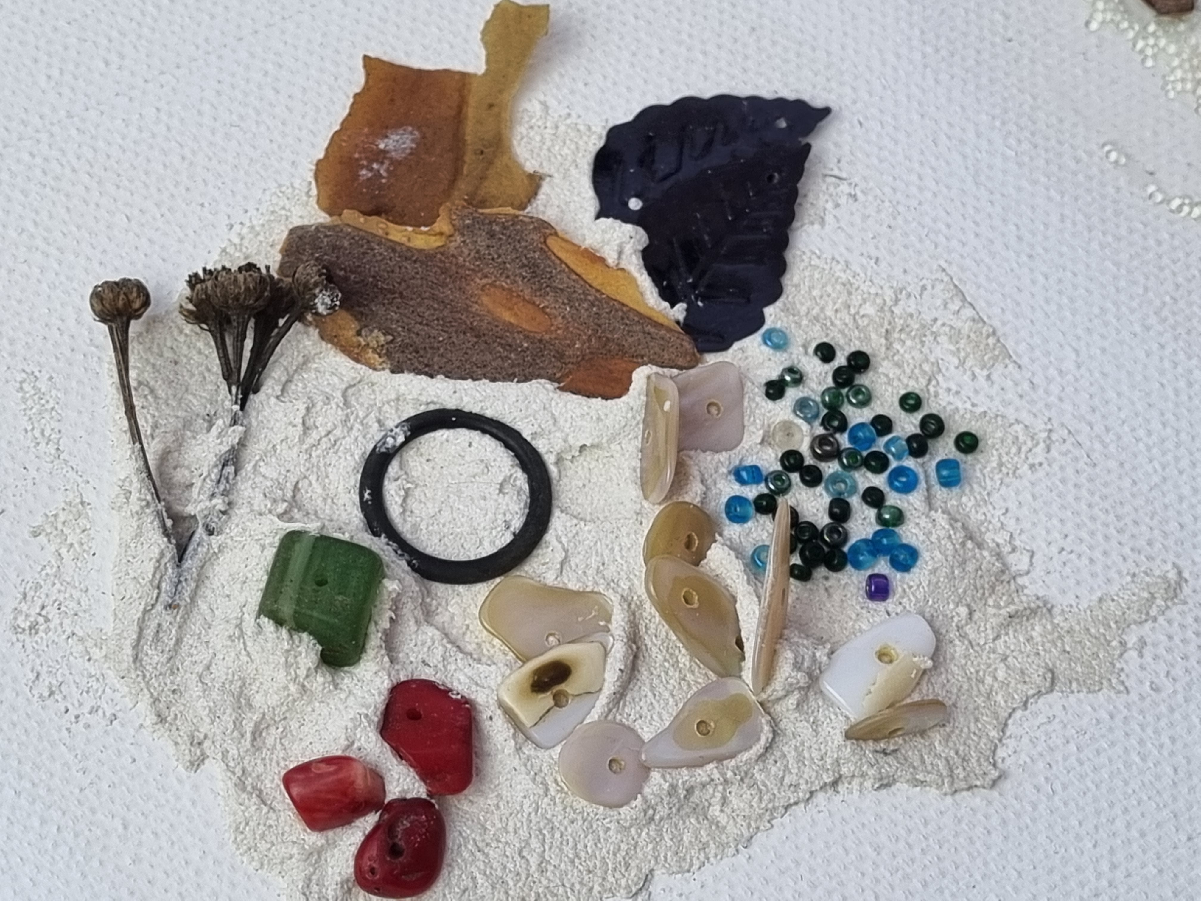 2 накладывается плотный слой и в него вдавливаются включения разного рода (бусины, сухоцветы, пайетки)