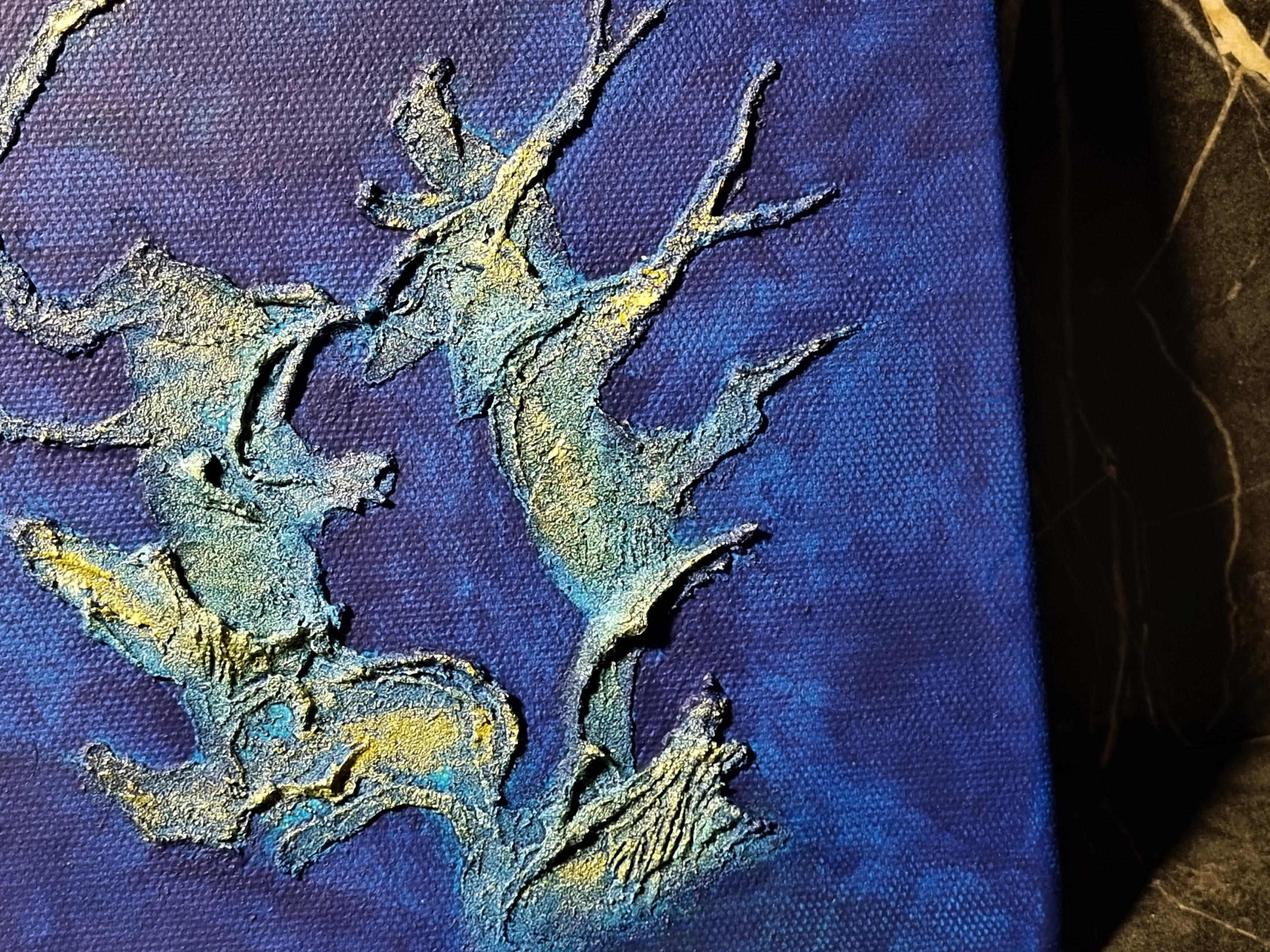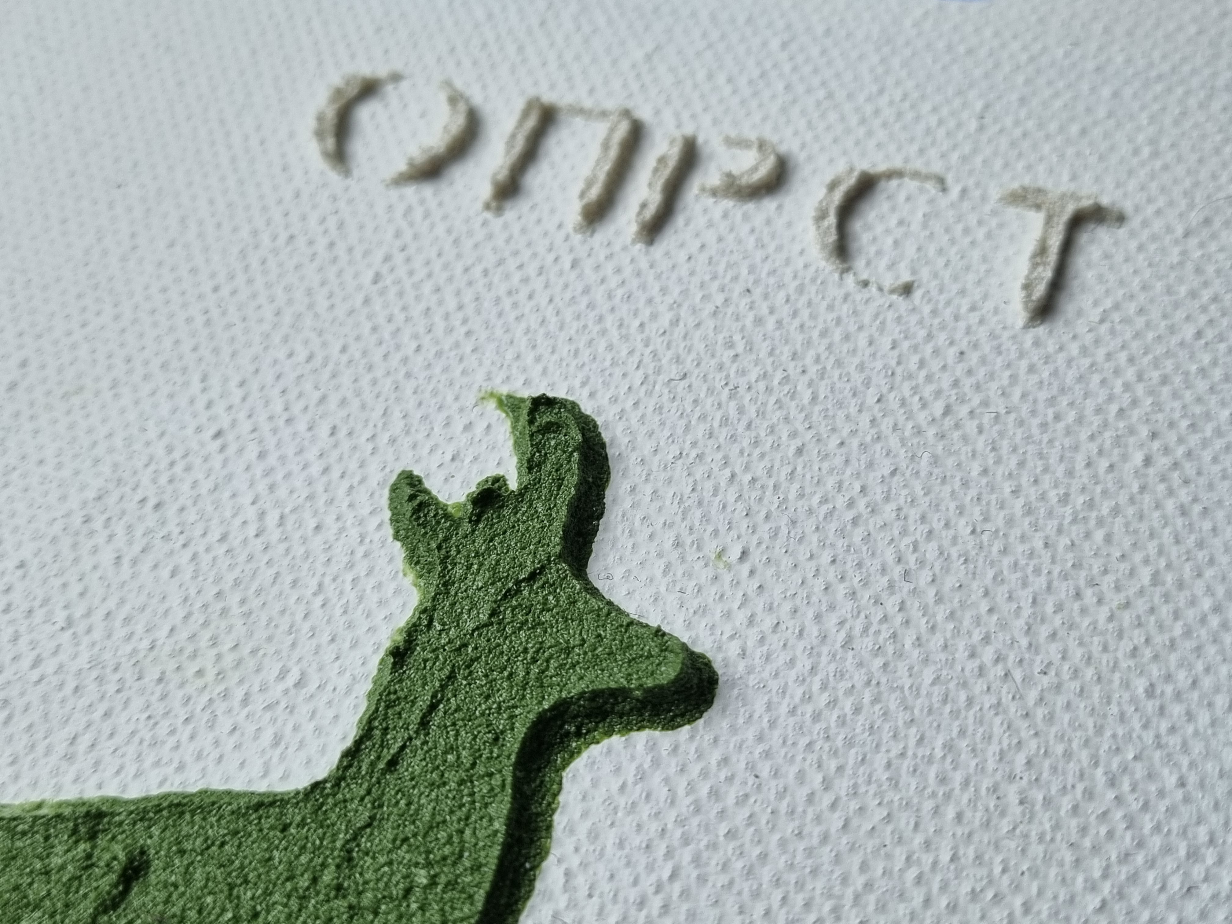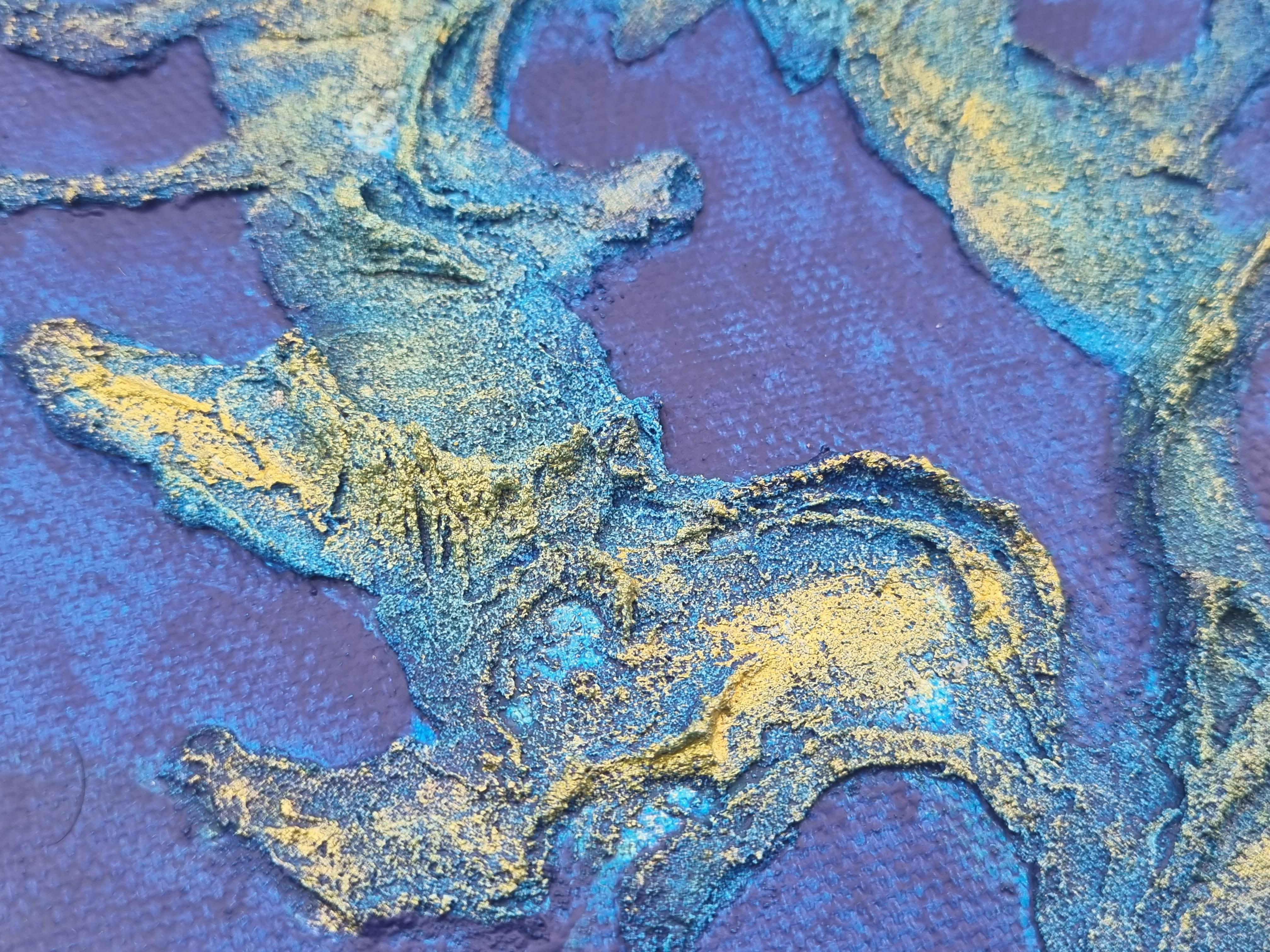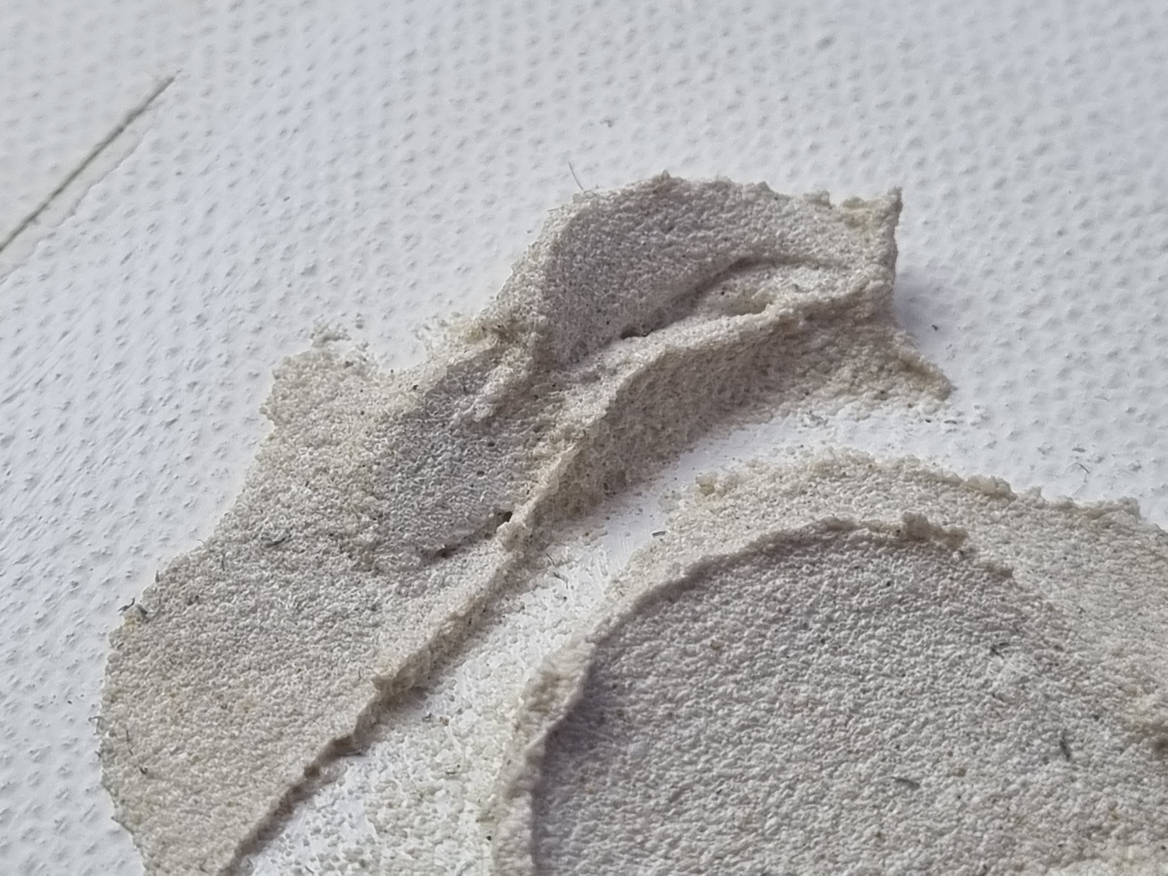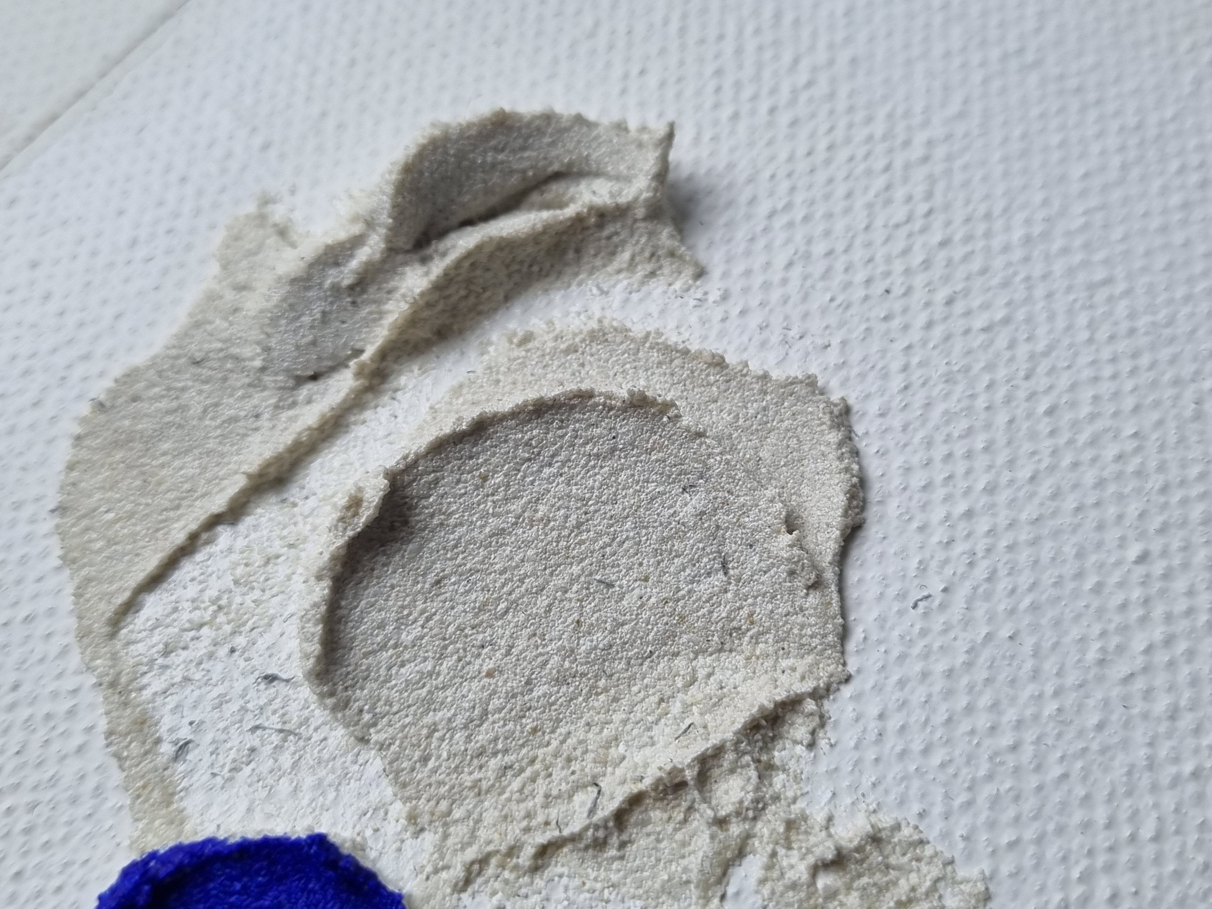 Последующие окрашивание такой поверхности сложно передать словами. Пористая поверхность, подобно хорошей хлопковой бумаге, пьющей воду и акварель, жадно вбирает в себя акрил. Моментально подчёркивает каждую микровпадинку и сохраняет песочную фактуру, сразу же стабилизируется.