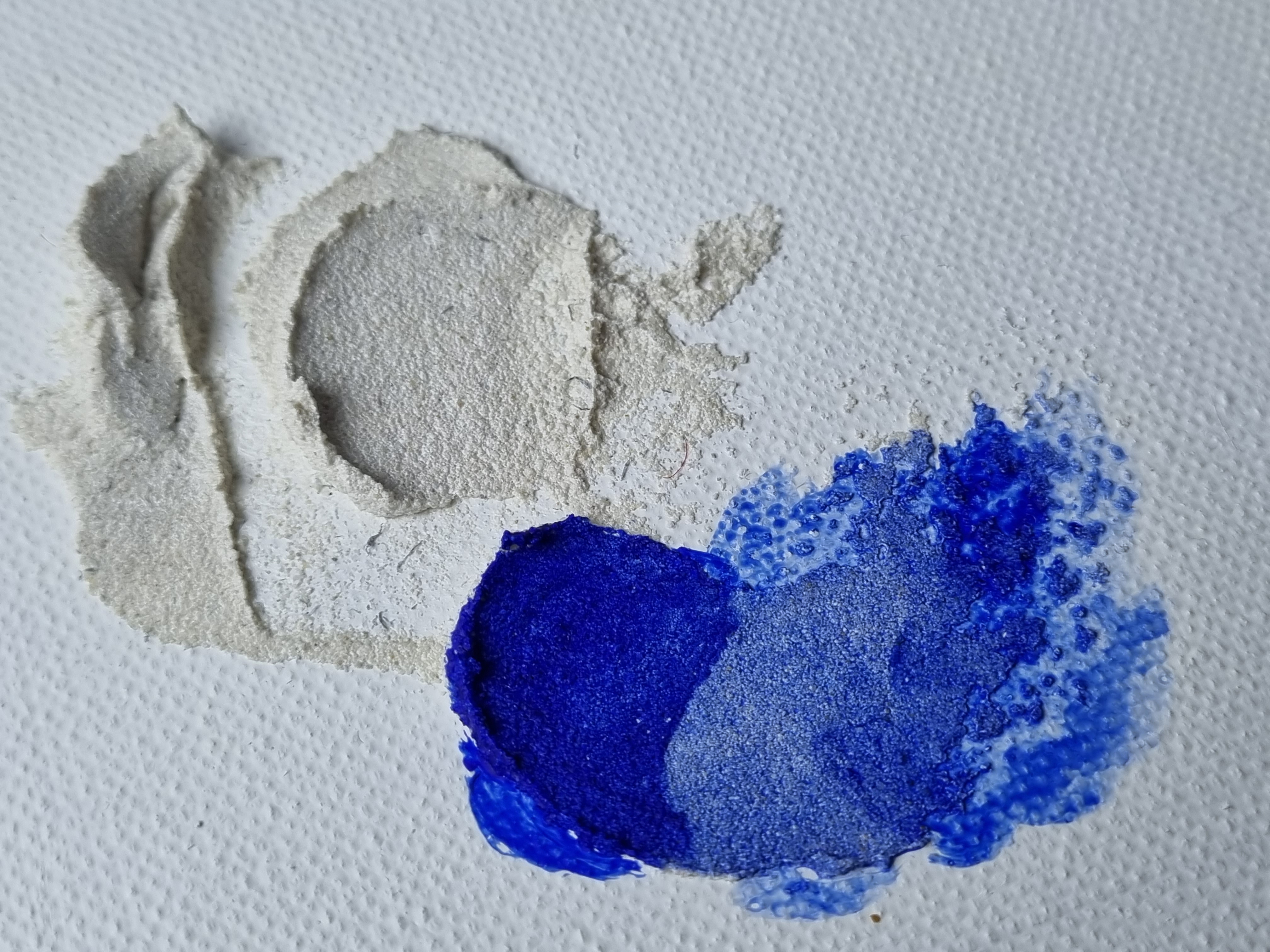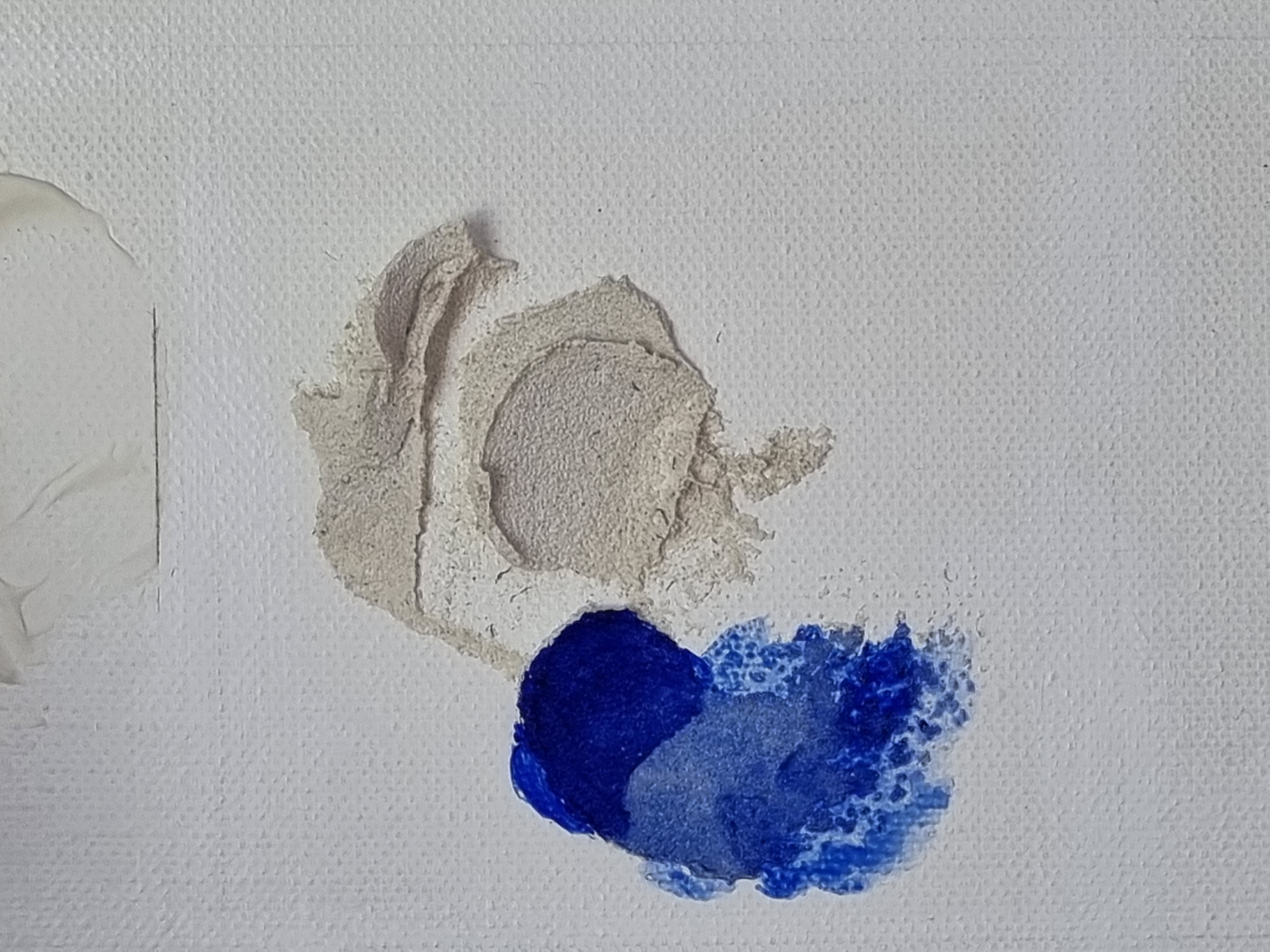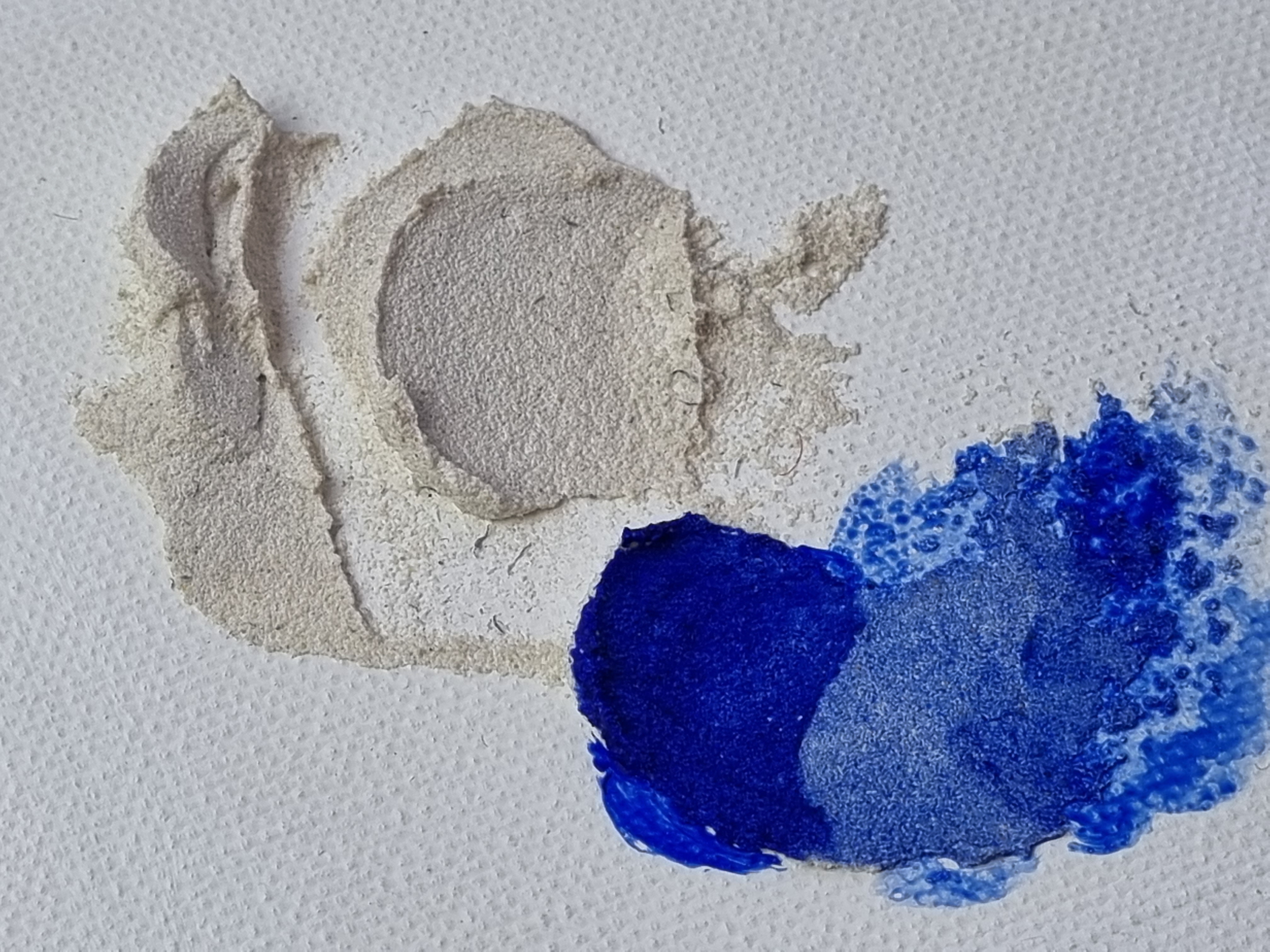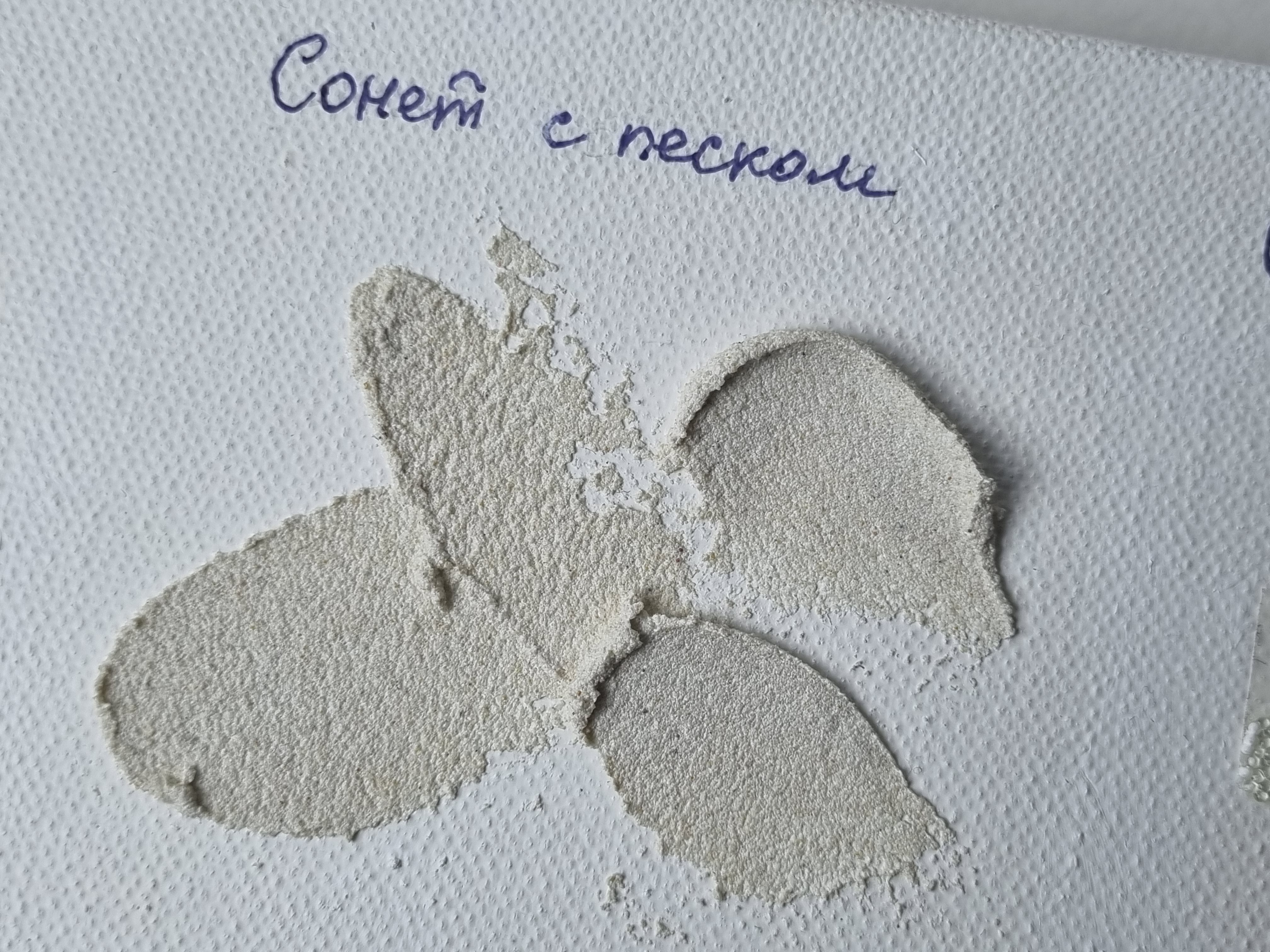 Важно отметить, что слой не трескается на холсте на подрамнике, т.е. на подвижной подложке, что очень важно и вовсе не повсеместно для такого рода материалов. При продавливании с изнанки холста, масса не расходится, образовывая трещины, а демонстрирует прекрасную адгезию с основой и свою целостность.