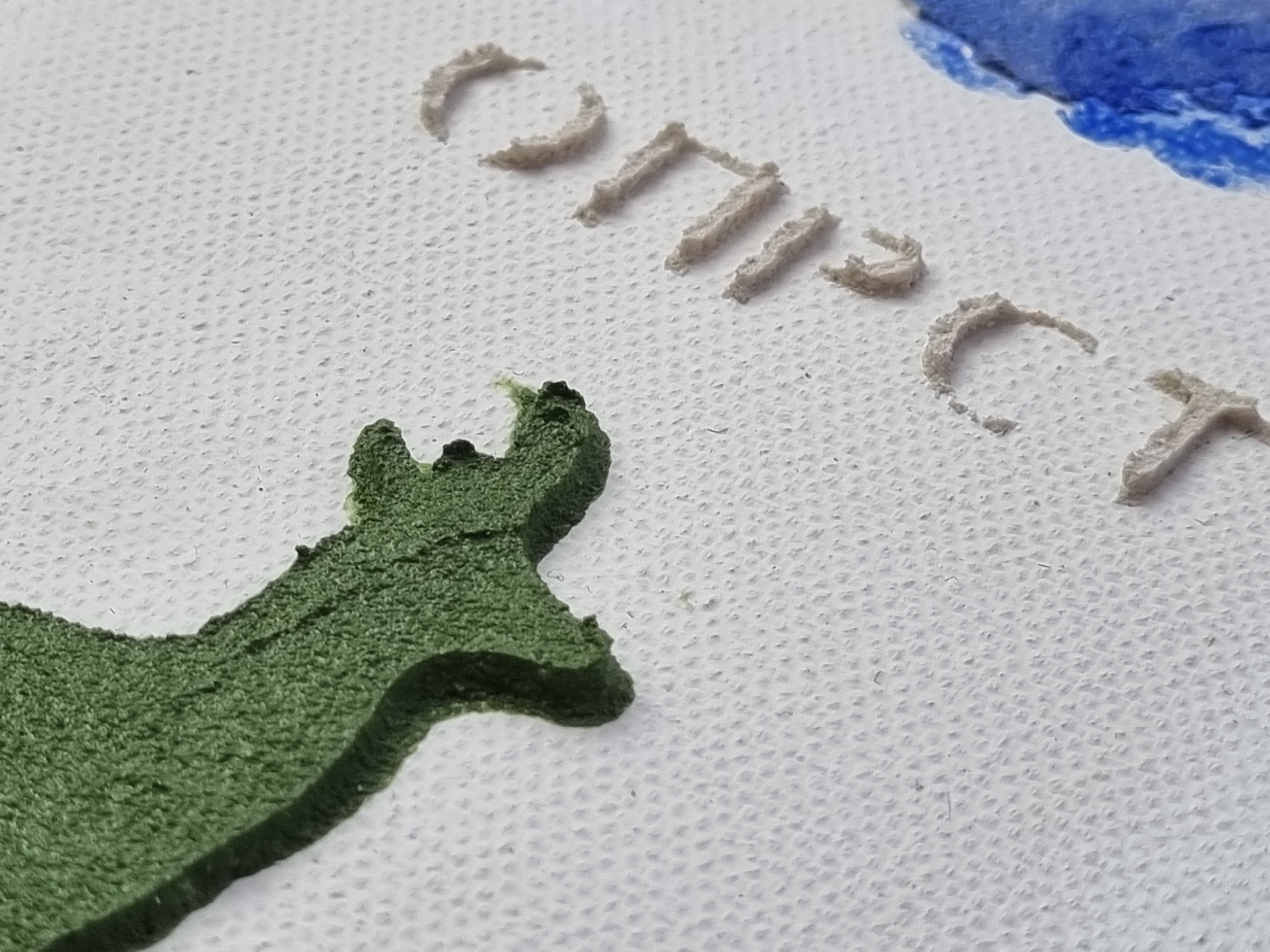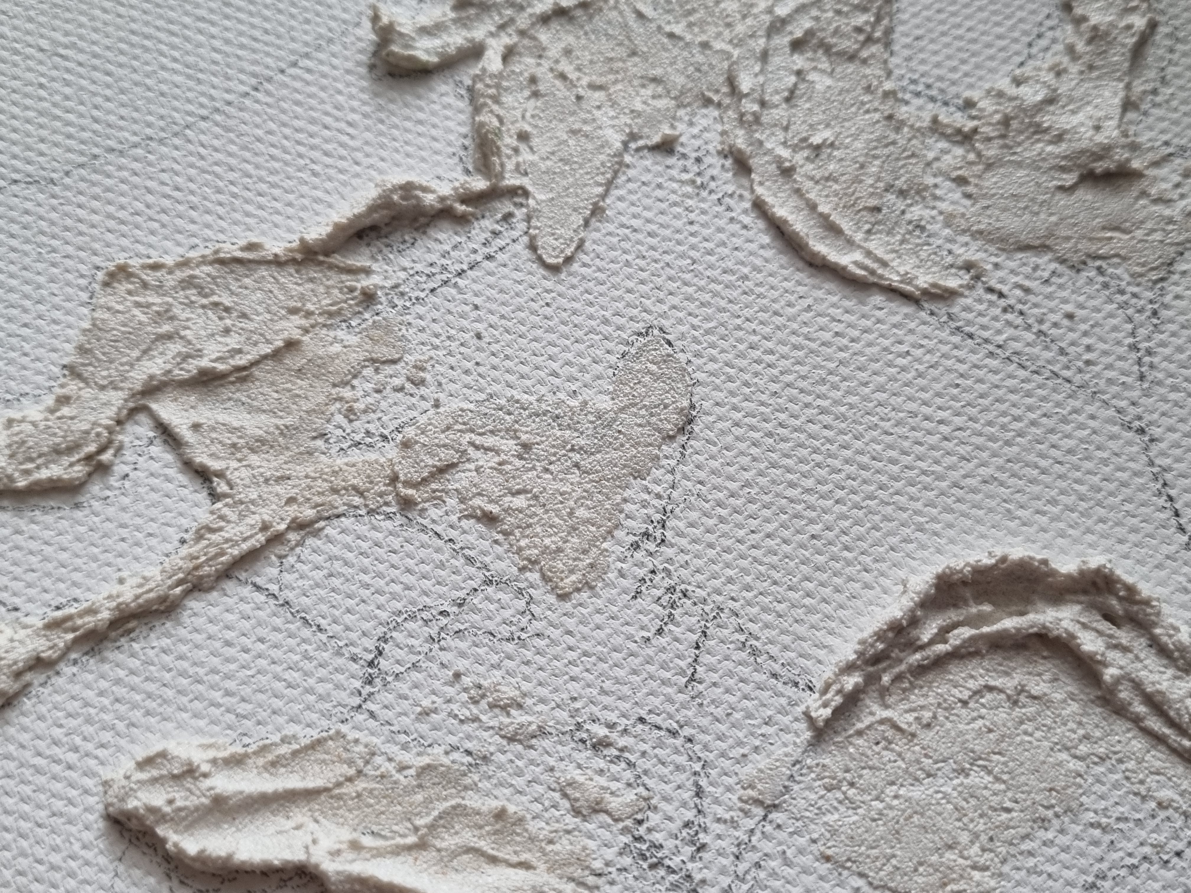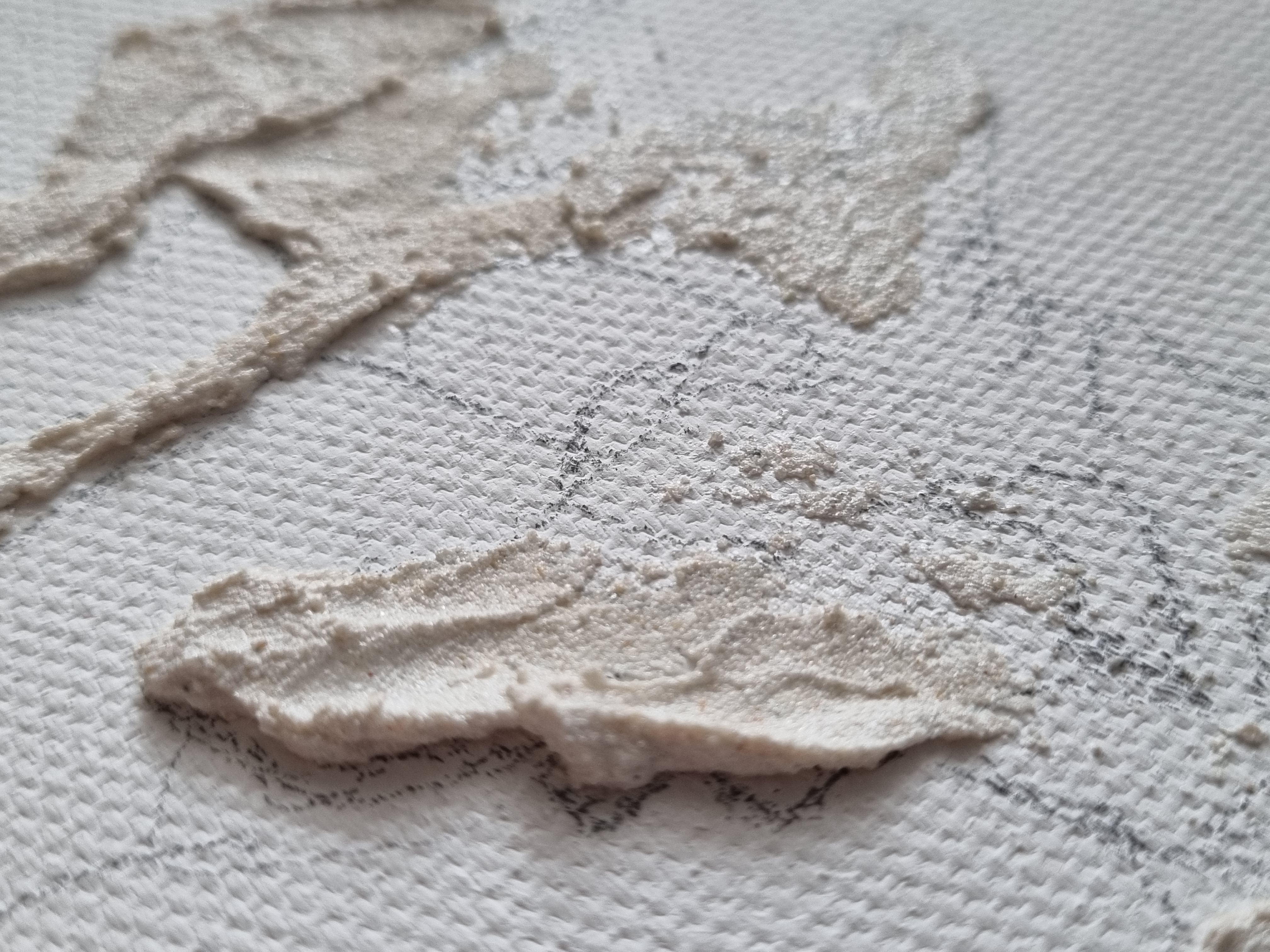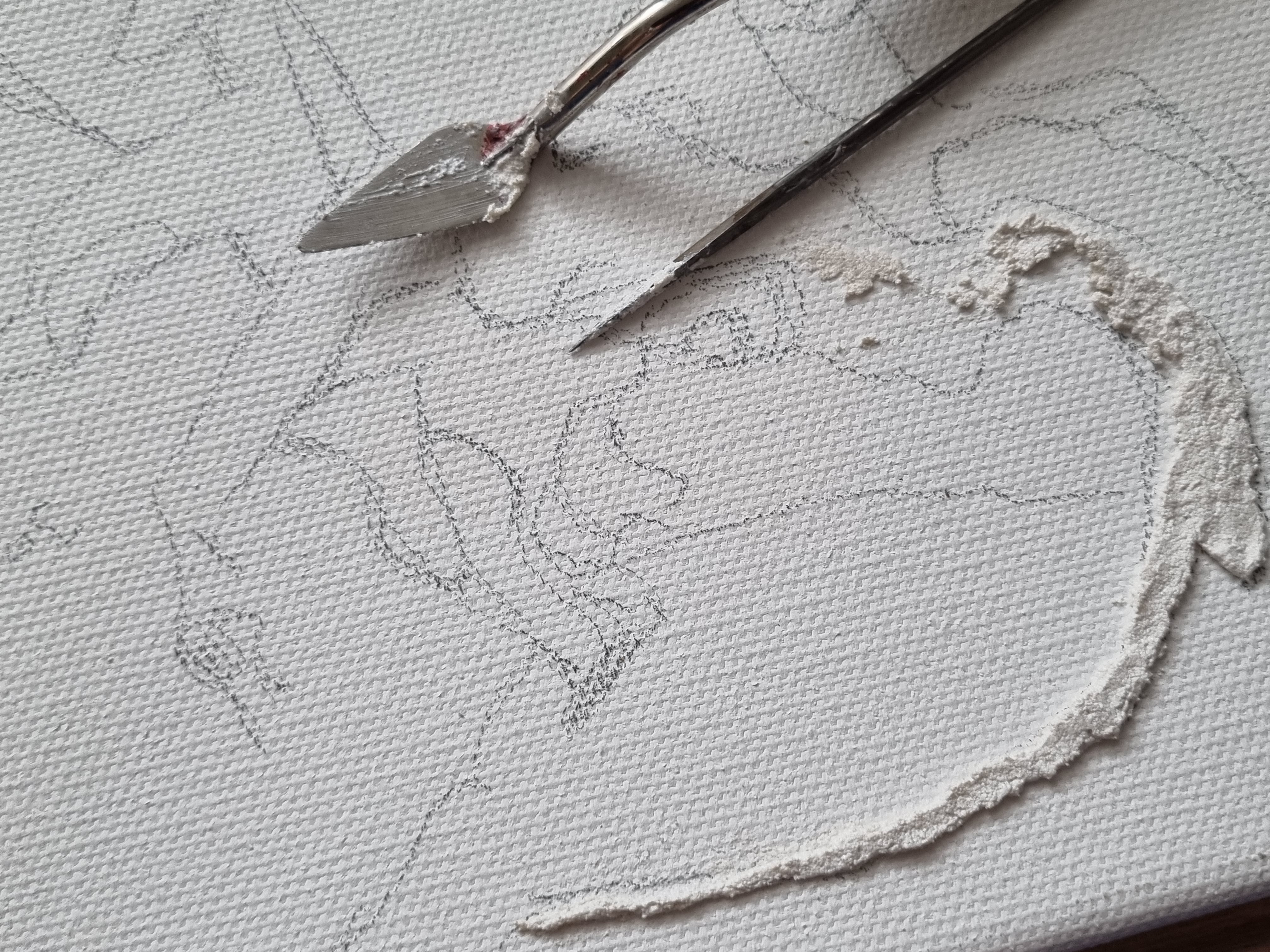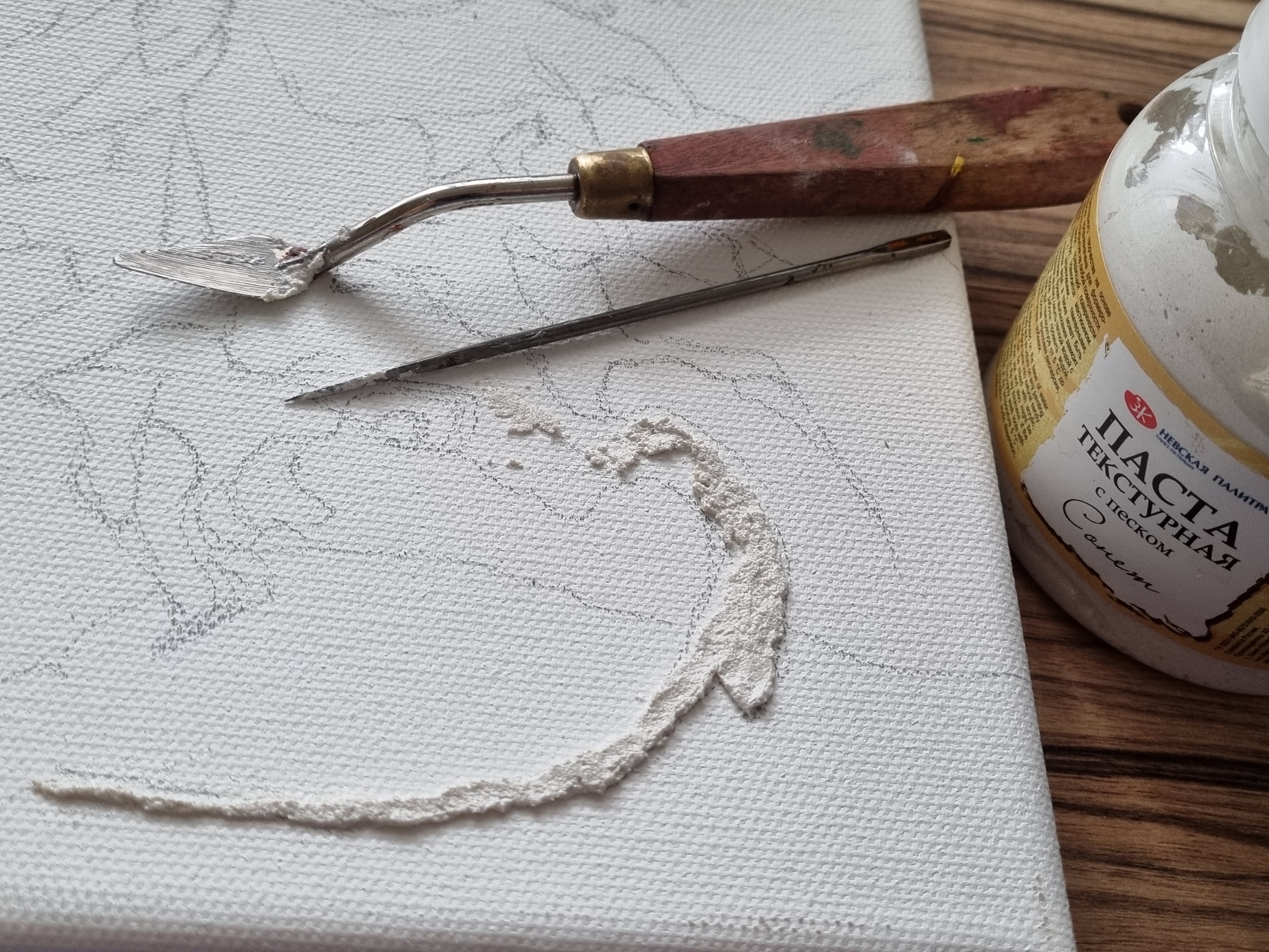 Важно отметить, что слой не трескается на холсте на подрамнике, т.е. на подвижной подложке, что очень важно и вовсе не повсеместно для такого рода материалов. При продавливании с изнанки холста, масса не расходится, образовывая трещины, а демонстрирует прекрасную адгезию с основой и свою целостность.