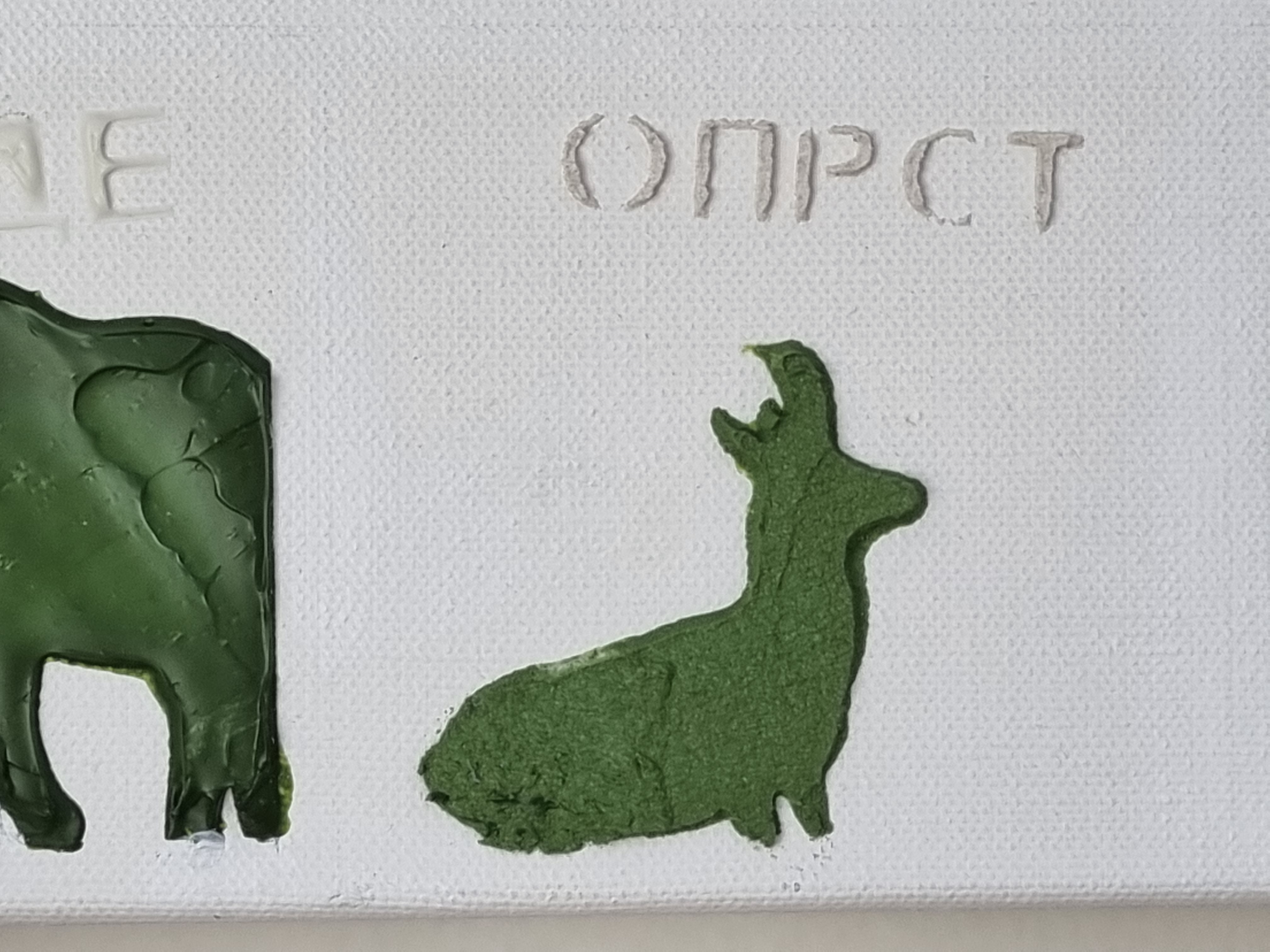4 через трафарет наносится окрашенная паста и бесцветные тонкие элементы (буквы).