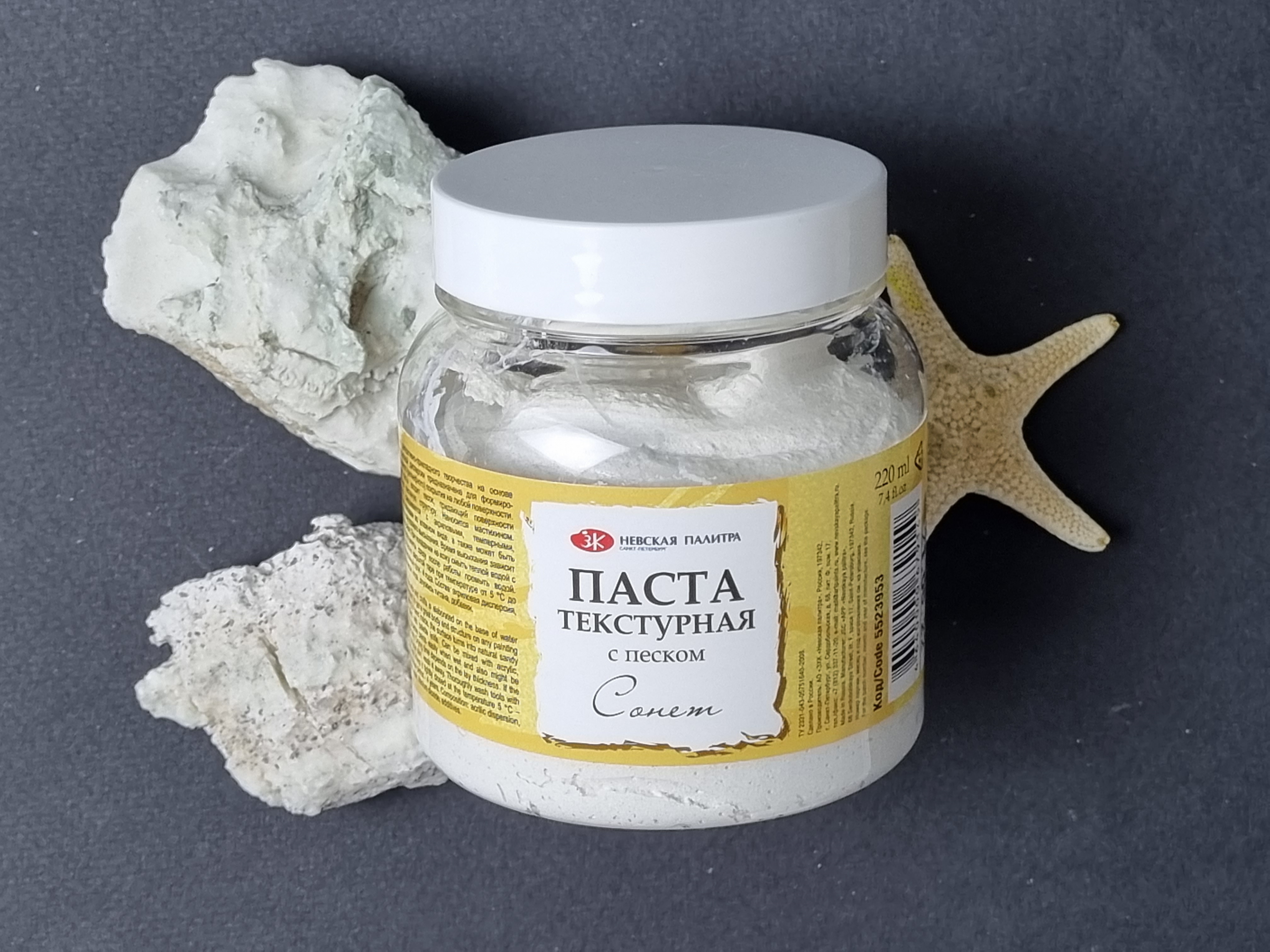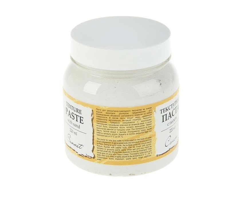 Белая паста с песком "Сонет" предназначена для декоративно-прикладного творчества. Масса на основе водной акриловой дисперсии используется для формирования объемного (рельефного) покрытия на любой поверхности.