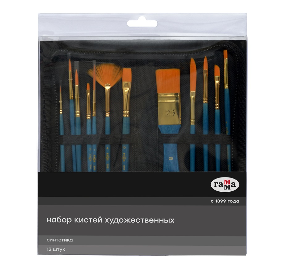 Набор художественных кистей в тканевом пенале ГАММА серии «Галерея» состоит из 12 кистей востребованных форм и размеров: круглая № 2/0; 3; 6; плоская № 2; 8; 10; веерная № 4, плоскоовальная № 6, лайнер № 1, даггер № 6, плоская скошенная № 6, флейц № 25.