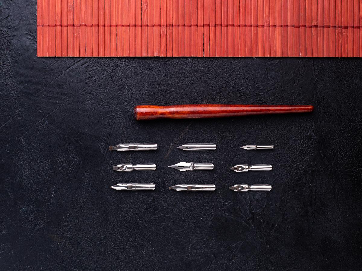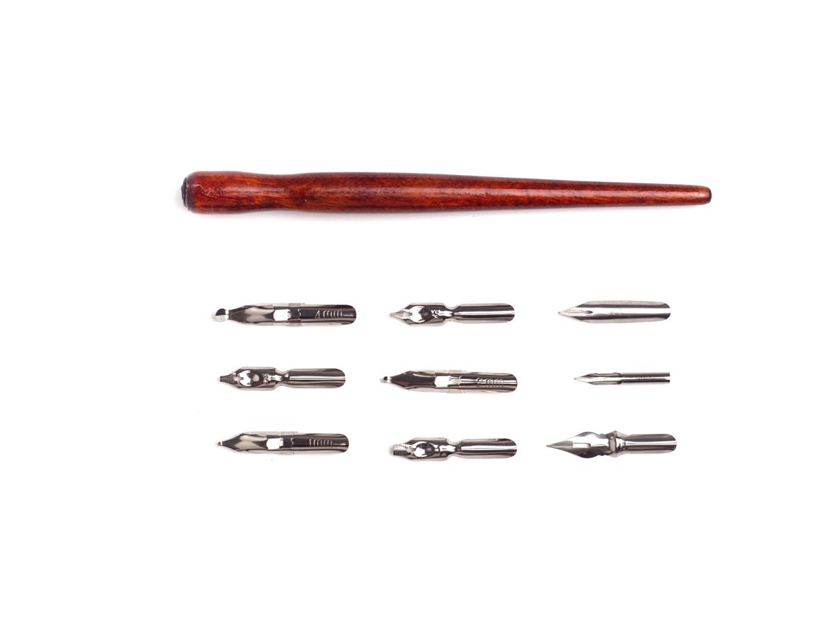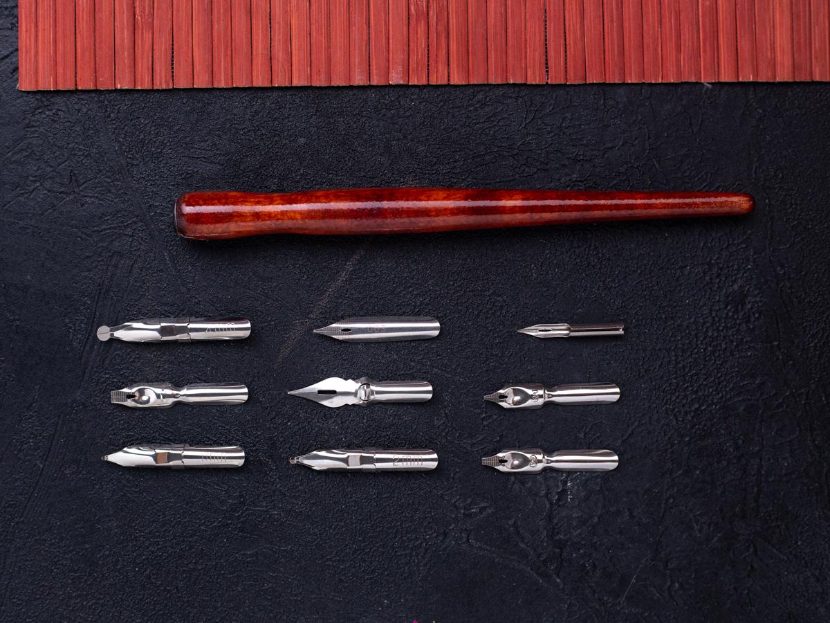 В набор для каллиграфии входят 9 металлических перьев и прямой держатель, который удобен для рисования и каллиграфии тушью и чернилами.
