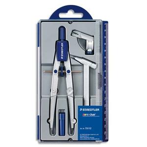 Циркуль Noris Club 550, со сгибающимися ножками с механизмом точной регулировки диаметра окружности до 260 мм (с удлинительной штангой диаметр окружности до 395 мм), длина - 156 мм, в пластиковом футляре, с запасными грифелями, удлинителем и адптером