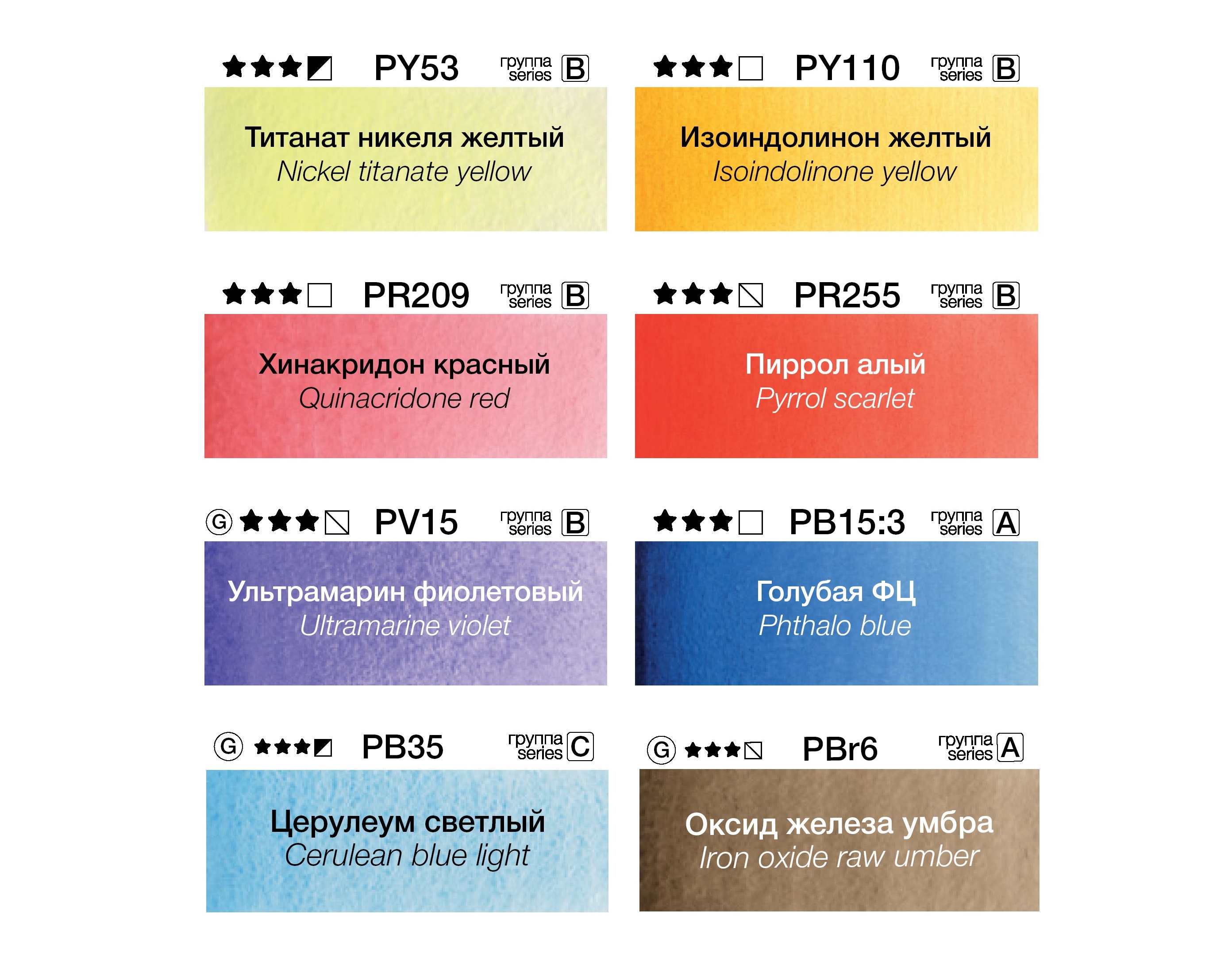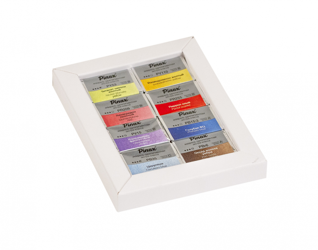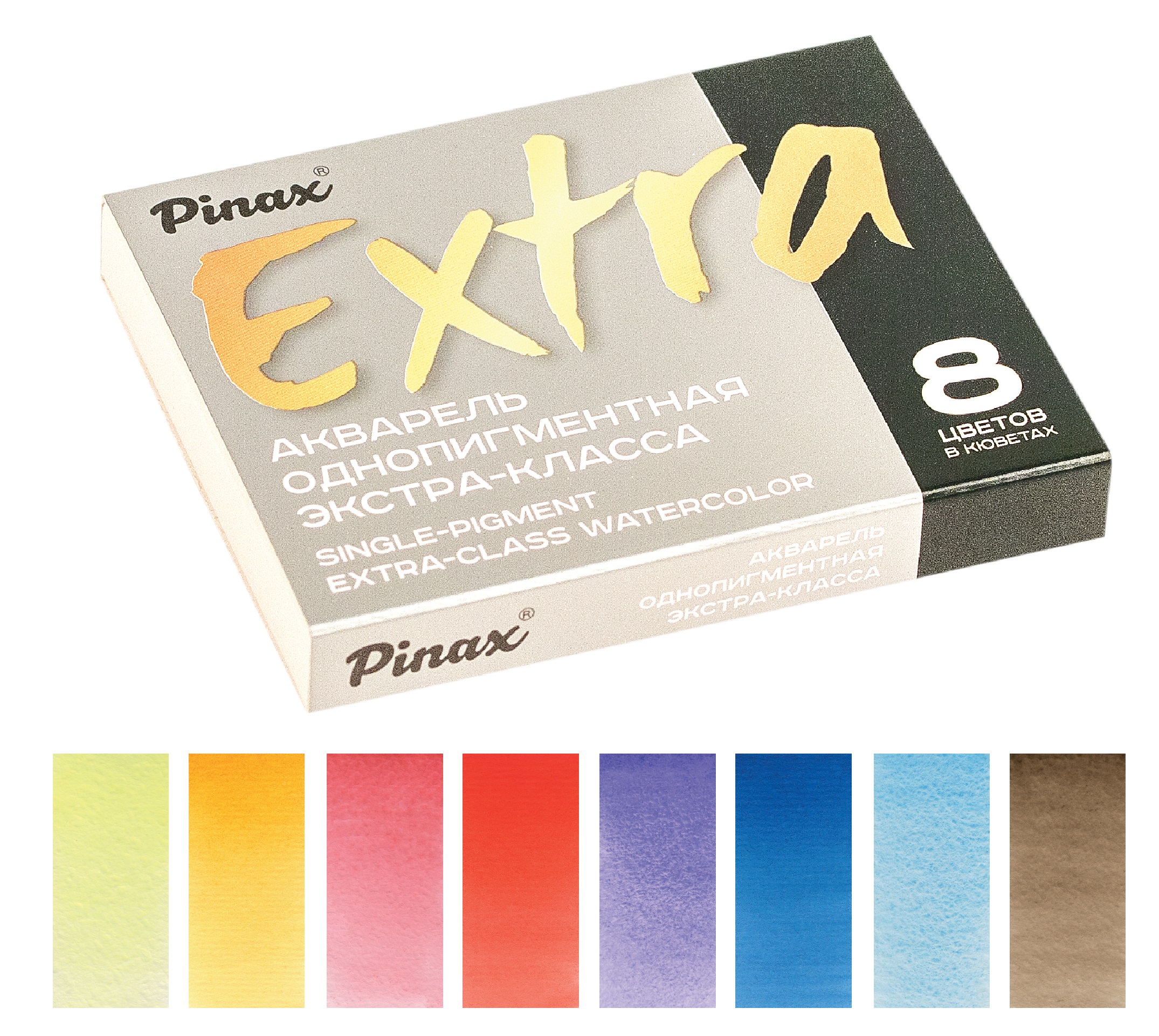 Набор из 8 однопигментных цветов акварели Pinax серии EXTRA. Цвета в наборах подобраны профессиональными художниками для получения гармоничных цветовых комбинаций. Краски прекрасно смешиваются и идеально подходят для всех акварельных техник.