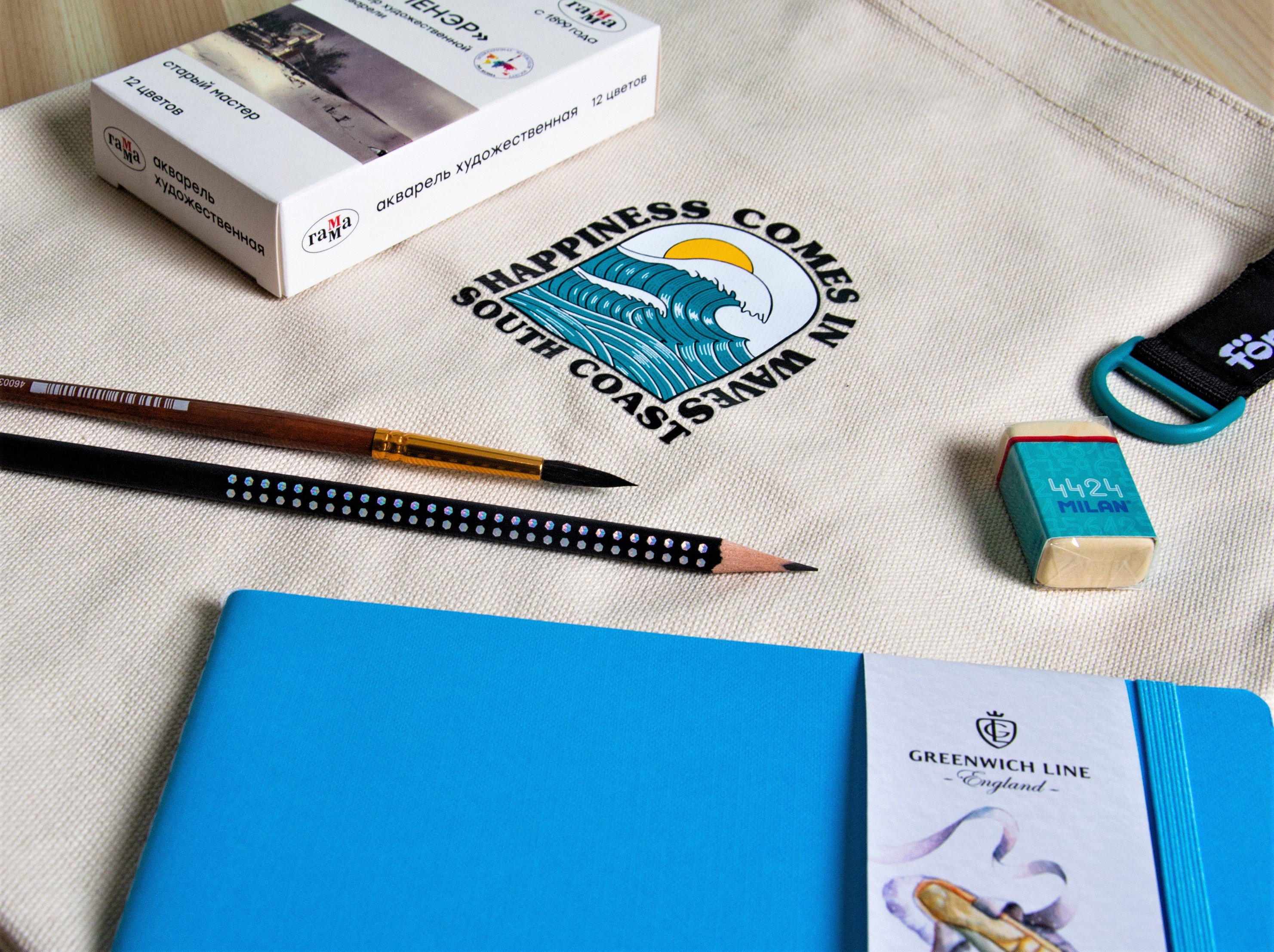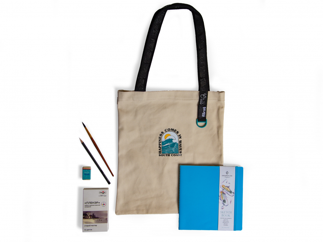 Комлект "South coast": сумка-шоппер, хлопковый скетчбук акварели, кисть, карандаш и ластик sela25