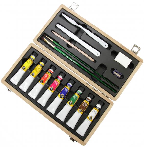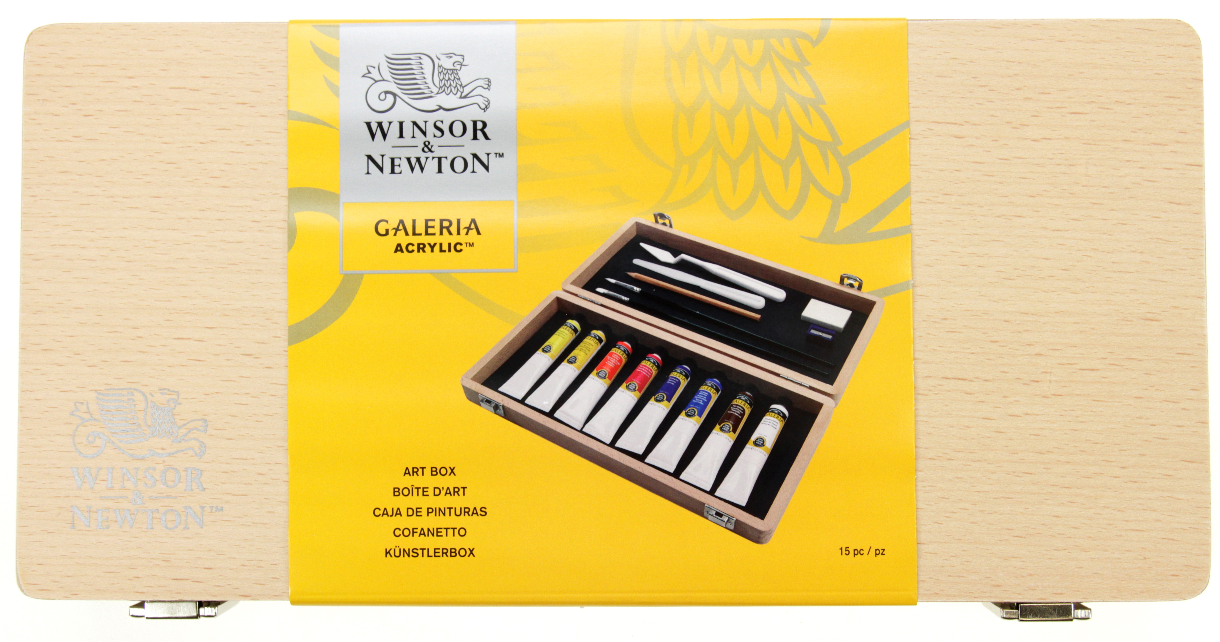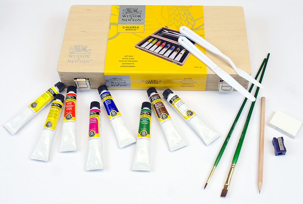 Маленький набор акриловых красок Galeria в деревянной коробке. Состав: 8 х 20 мл акриловых красок; 1 х карандаш; 2 х кисти; 2 х мастихина; 1 х ластик-клячка; 1 х точилка; 1 х брошюра