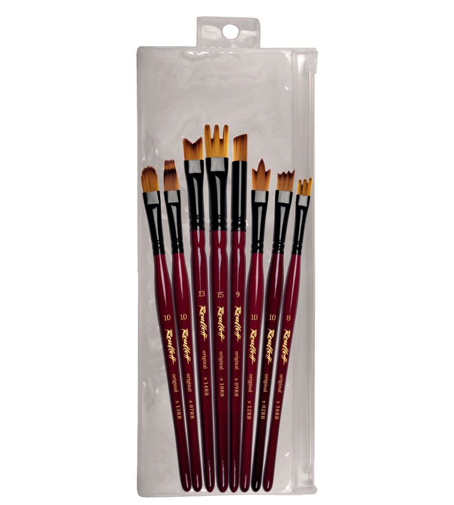 original 02RB - «рельеф», эта плоская кисть с фигурным краем позволяет выполнять мазки сложной формы. Для создания более живописных мазков можно набирать дополнительные цвета на выступающие края. Это создает впечатление, что мазок выполнен в несколько приёмов. Помогает ускорить процесс росписи.