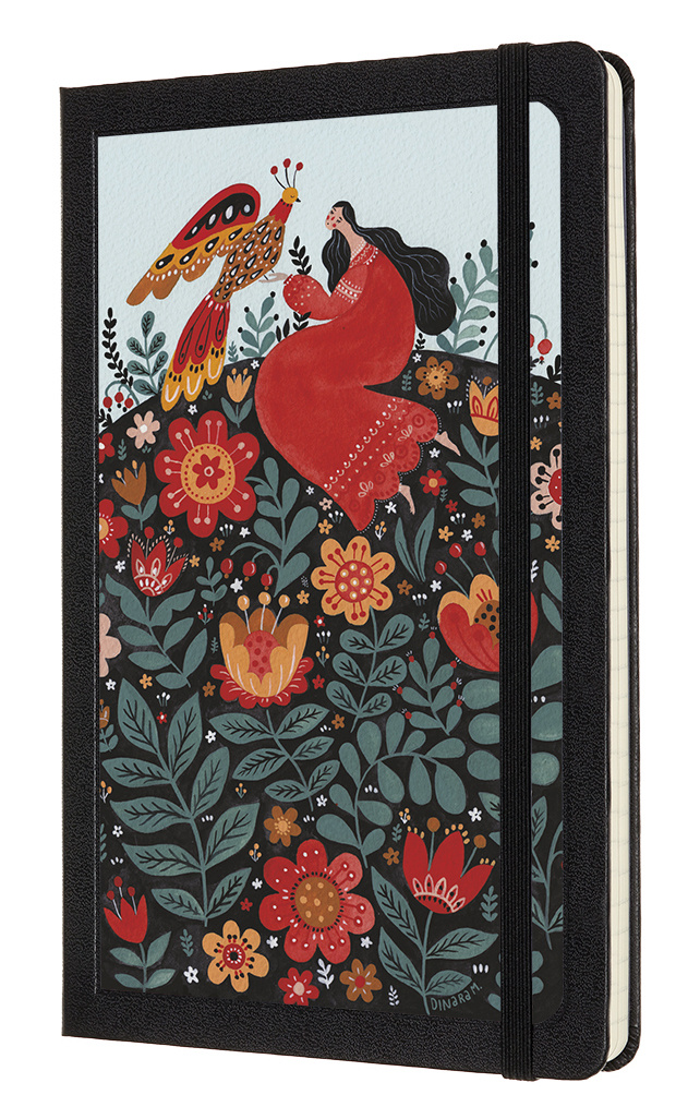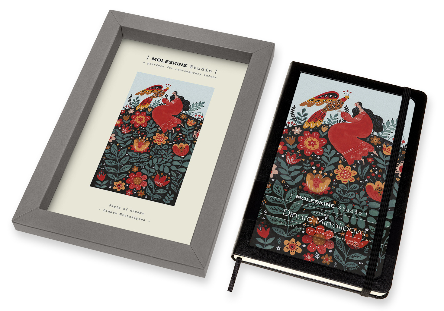 Отправьтесь в путешествие по красочному фольклорному творчеству Динары Мирталиповой. Динара – иллюстратор-самоучка и дизайнер, чья страсть к творчеству проявляется в ее ярких мотивах, вдохновленных фольклором. Динара родилась и выросла в Узбекистане, и ее искусство опирается на богатое культурное наследие страны, воспевая ее различия, а также она черпает вдохновение в эклектичном смешении природы, историй, истории, музыки и мест. Это произведение под названием Поле снов было создано Динарой специально для Moleskine