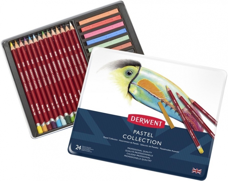 Набор Pastel Collection, 24 шт. в металлической коробке (8 шт. сухой пастели DERWENT + 14 шт. пастельных карандашей PASTEL + ластик-клячка + точилка для пастели)