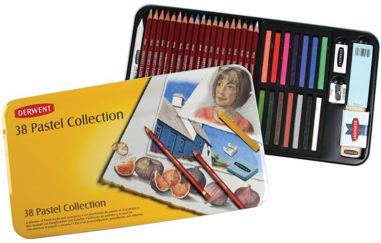 Набор Pastel Collection, 38 шт. в металлической коробке (14 шт. сухой пастели DTRWENT + 19 шт. пастельных карандашей PASTEL + ластик + ластик-клячка + точилка для пастели + наждачная бумага + палочка для растушевки)