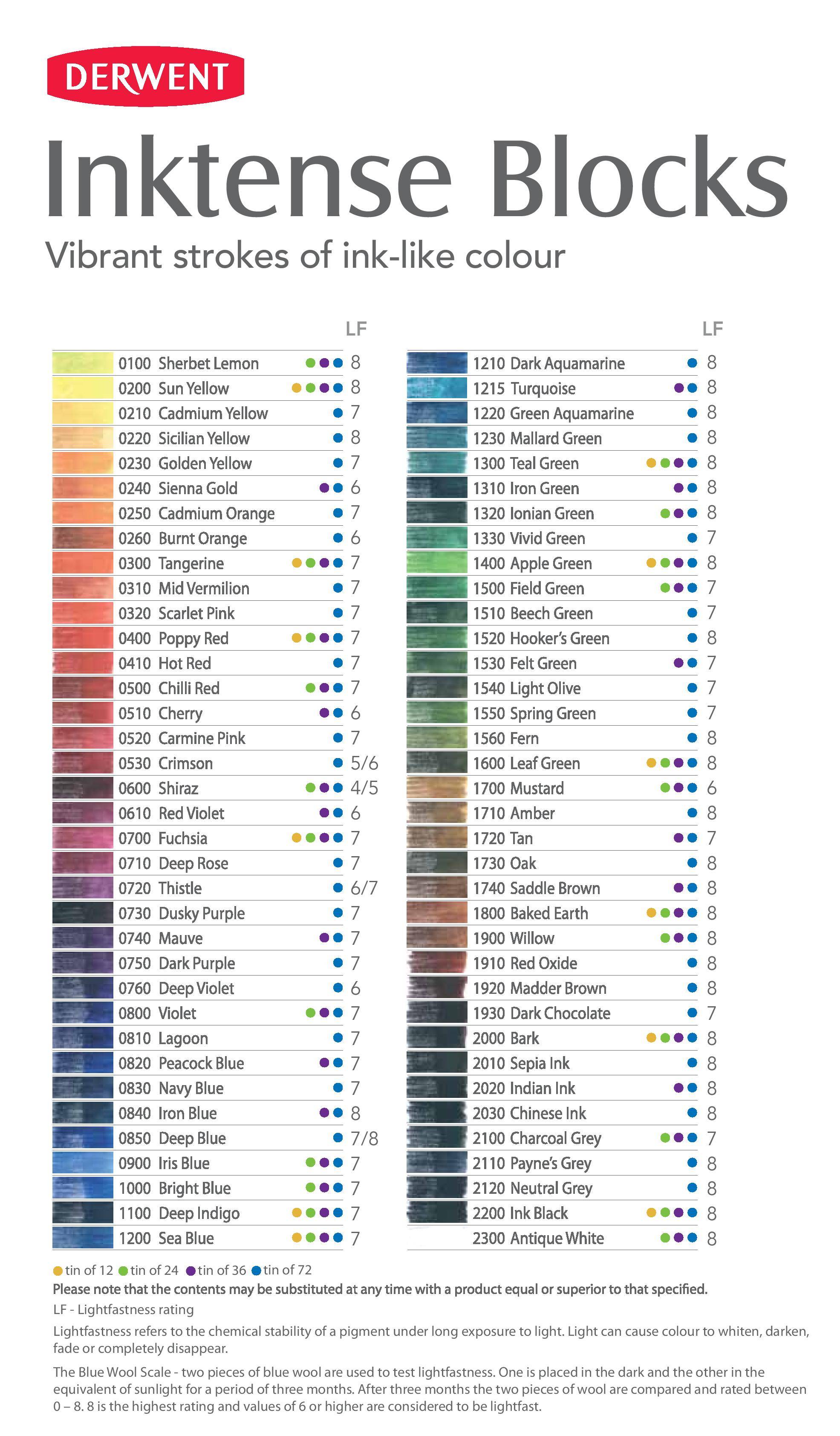 Водорастворимые блоки Derwent Inktense позволяют работать в любой технике: 'мокрой', сухой или смешанной. В наборе вся цветовая гамма серии Derwent Inktense Blocks. Цвета легко смешивать как одновременно, так и послойно. Это позволяет создавать бесконечное количество оттенков. После размытия водой проявляется эффект чернил. Повторно размыть рисунок не получится. После высыхания рисунок, сделанный блоками Inktense, становится устойчивым к влаге. Помимо классических поверхностей (бумага, картон, дерево) позволяет работать на шелке или хлопке. Форма блоков позволяет работать как с тонкими штрихами, так и с большими по полощади участками. Блоки Derwent Inktense не крошатся и почти не оставляют пыль при работе