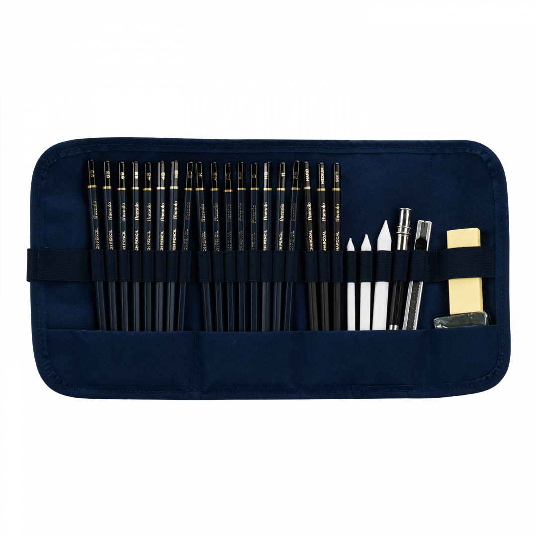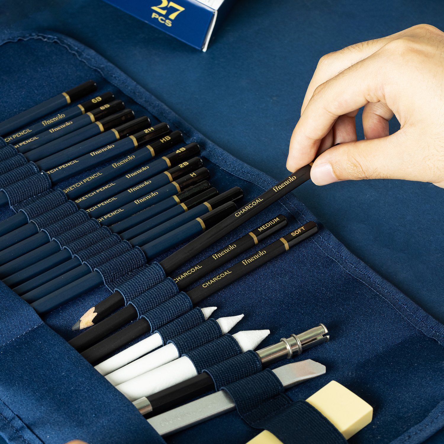 Набор для скетчинга Finenolo карандаши, ластики, аксессуары 27 предметов в пенале-свитке