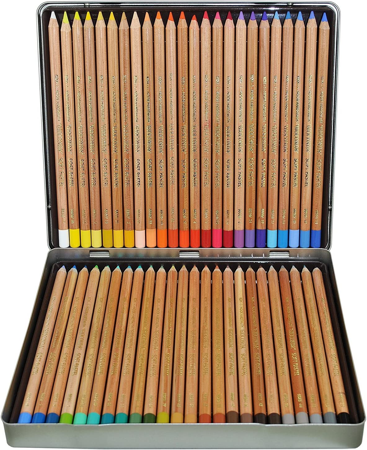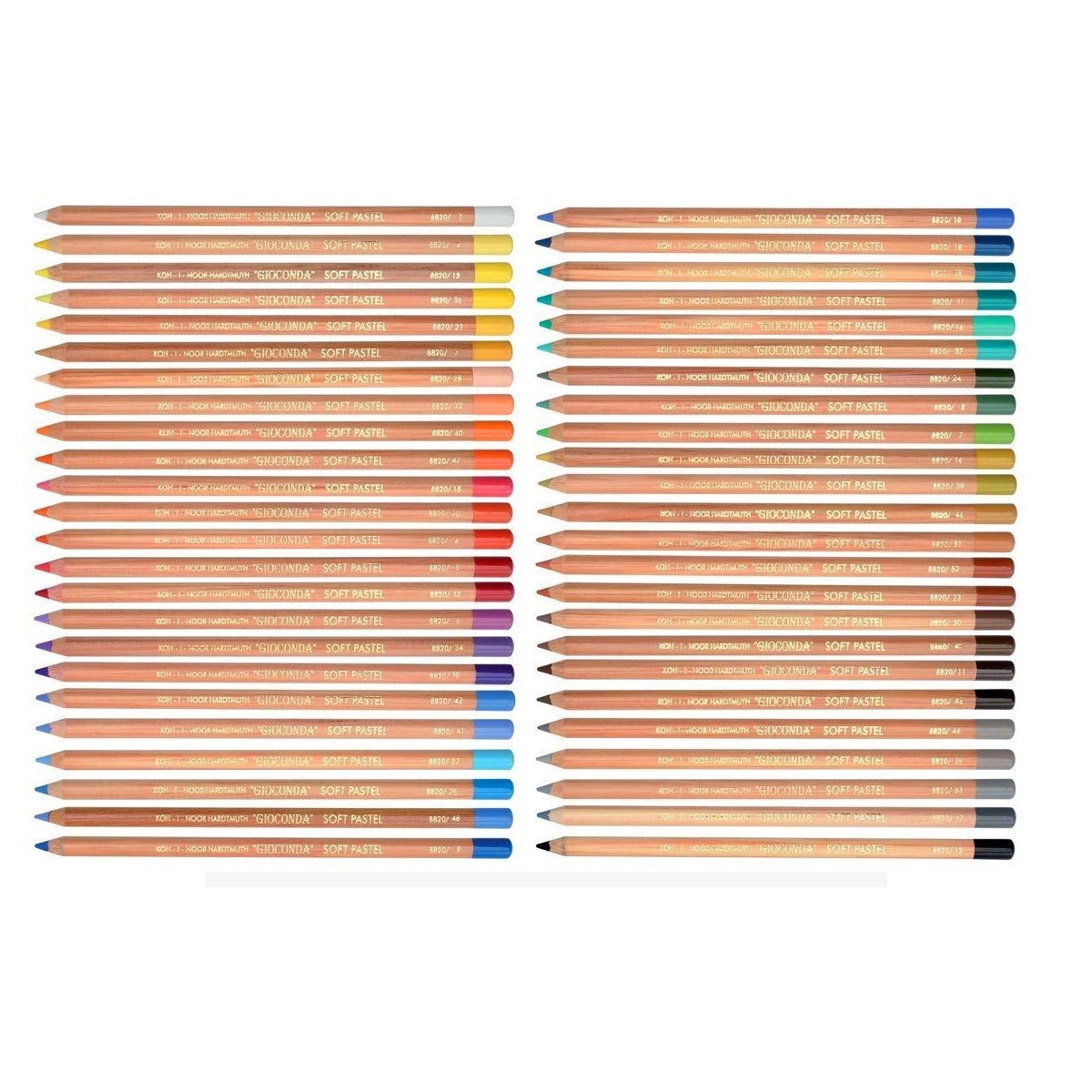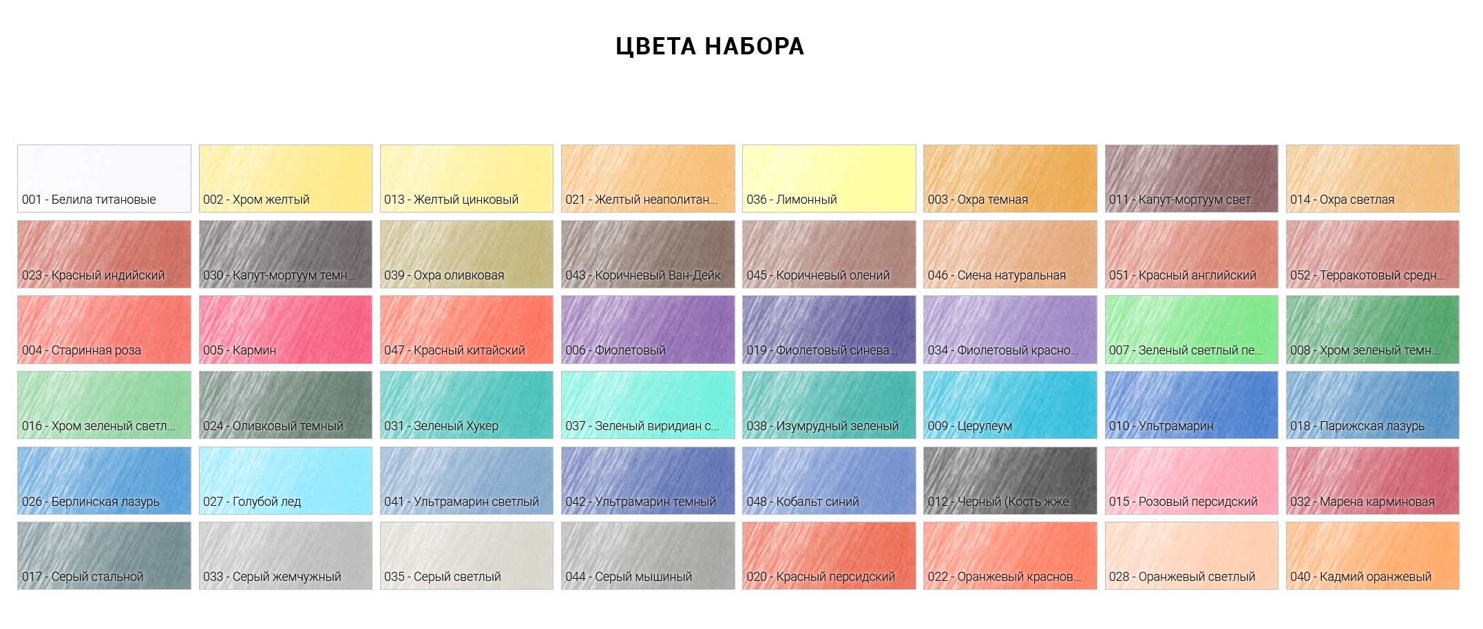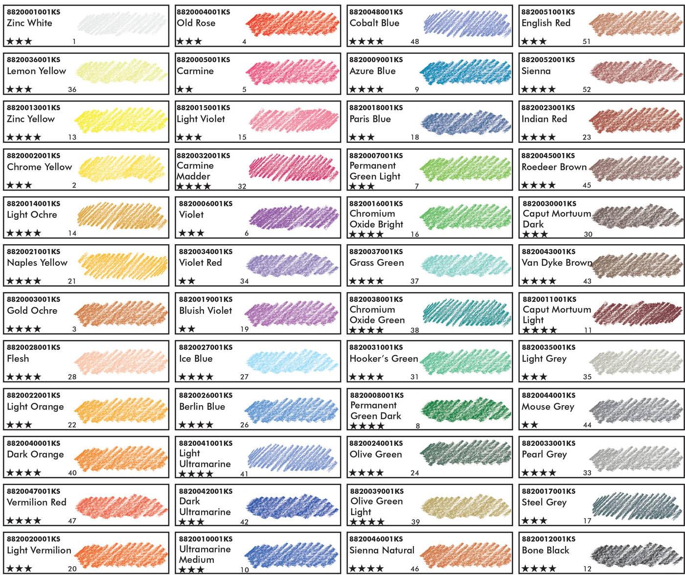 В набор входят 48 пастельных карандашей цветов: 001 Белила титановые, 002 Хром желтый, 013 Желтый цинковый, 036 Лимонный, 021 Желтый неаполитанский, 003 Охра темная, 028 Оранжевый светлый, 022 Оранжевый красноватый, 040 Кадмий оранжевый, 047 Красный китайский, 015 Розовый персидский, 020 Красный персидский, 004 Старинная роза, 005 Кармин, 032 Марена карминовая, 006 Фиолетовый, 034 Фиолетовый красноватый, 019 Фиолетовый синеватый, 041 Ультрамарин светлый, 042 Ультрамарин темный, 027 Голубой лед, 026 Берлинская лазурь, 048 Кобальт синий, 009 Церулеум, 010 Ультрамарин, 018 Парижская лазурь, 038 Изумрудный зеленый, 031 Зеленый Хукер, 016 Хром зеленый светлый, 037 Зеленый виридиан светлый, 024 Оливковый темный, 008 Хром зеленый темный, 007 Зеленый светлый перманентный, 014 Охра светлая, 039 Охра оливковая, 046 Сиена натуральная, 051 Красный английский, 052 Терракотовый средний, 023 Красный индийский, 030 Капут-мортуум темный, 011 Капут-мортуум светлый, 045 Коричневый олений, 044 Серый мышиный, 043 Коричневый Ван-Дейк, 033 Серый жемчужный, 035 Серый светлый, 017 Серый стальной, 012 Черный (Кость жженая).