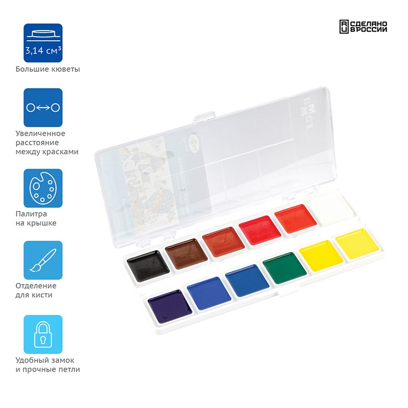 Кюветы с высокими бортиками и увеличенным расстоянием между красками предназначены для удобства в работе детей. Палитра для смешивания красок расположена на крышке. Акварель легко смывается с рук и отстирывается с одежды.