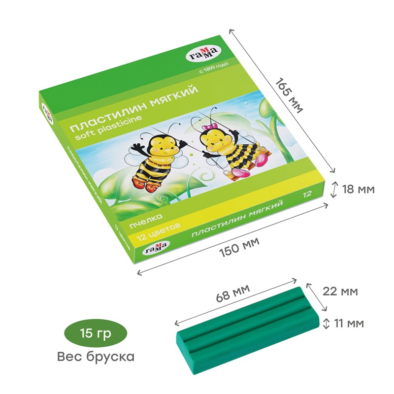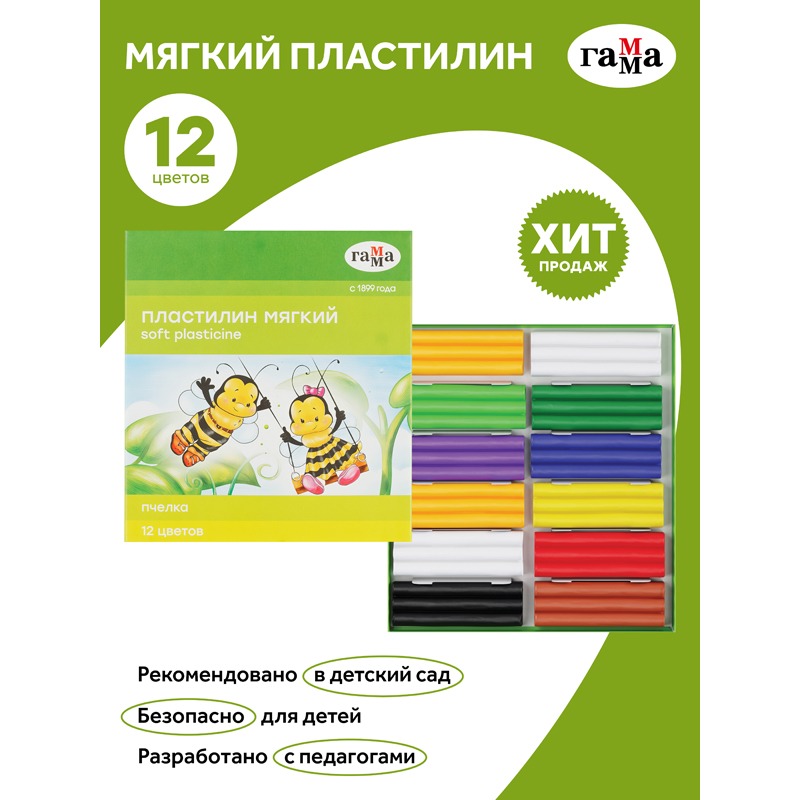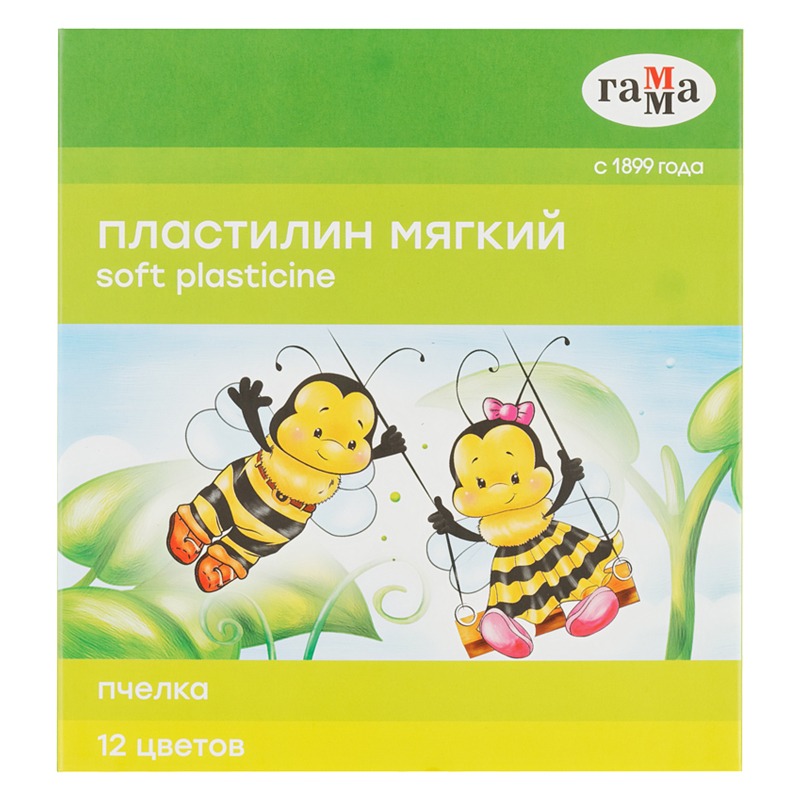 Пластилин восковой мягкий Гамма "Пчелка", 12 цветов, 180г, со стеком, картон. упаковка
