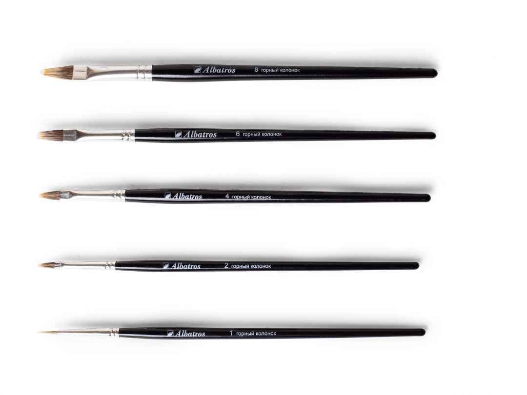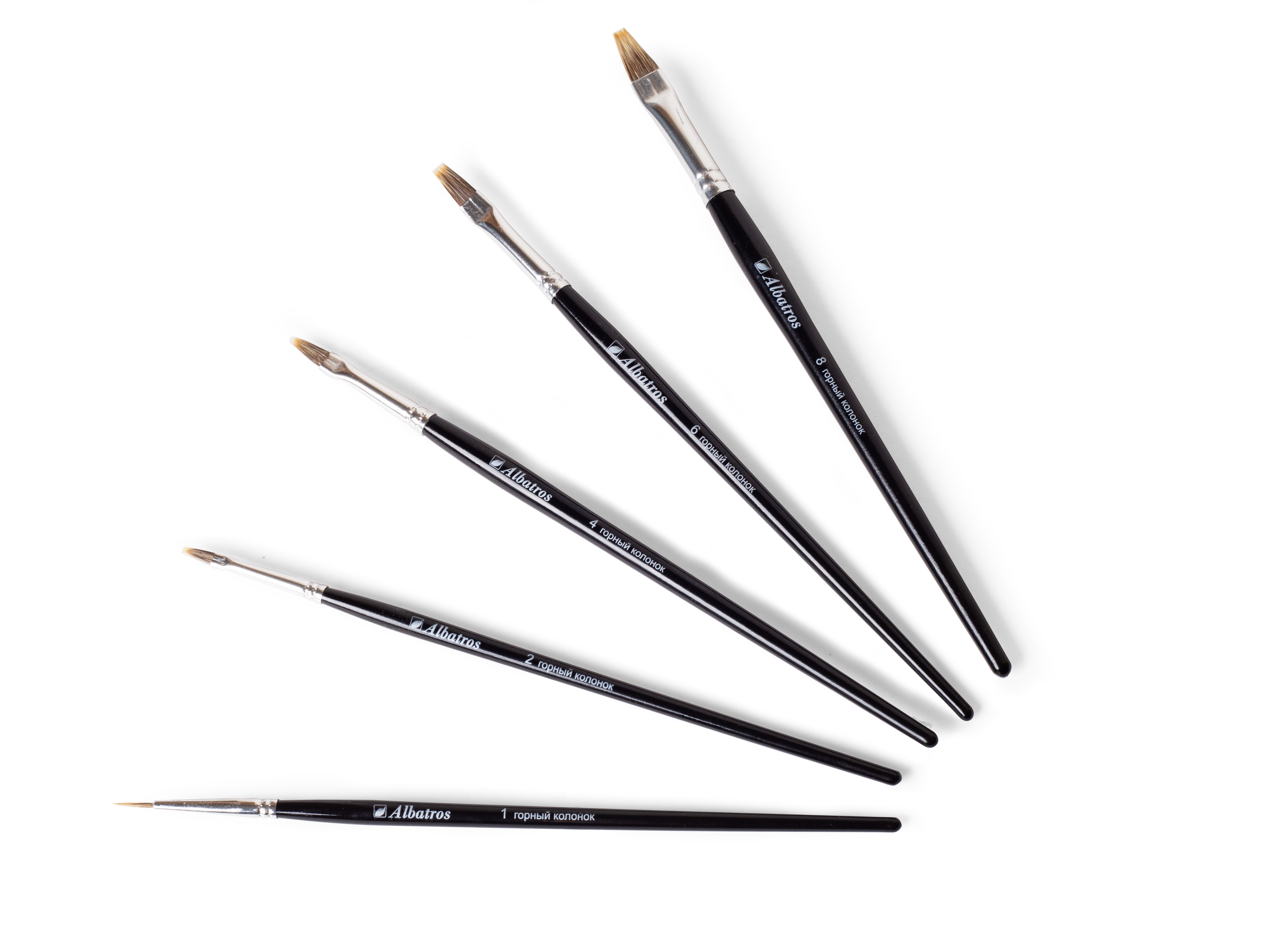 Набор из 5-ти плоских художественных кистей из горного колонка. Цельнотянутая алюминиевая обойма, короткая, глянцевая черная ручка.