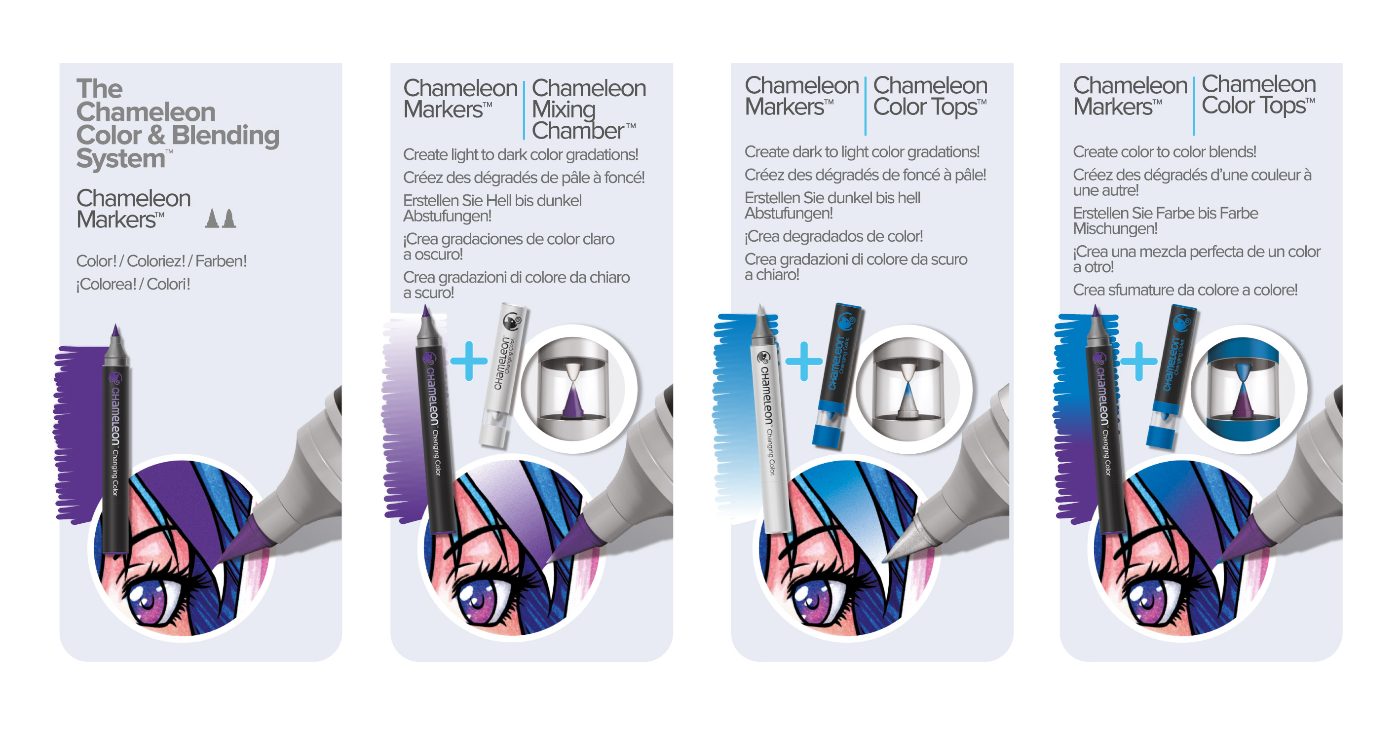 Blending System 10 - Это уникальный набор маркеров для смешивания оттенков от производителя Chameleon. Подборка № 10 содержит оттенки, подходящие для отрисовки персонажей. В состав набора входит 6 маркеров Chameleon, 5 цветных блендеров, 1 контейнер для смешивания и 6 супермягких браш-наконечников японского производства. На упаковке представлена красочная инструкция по применению. Набор является настоящей системой по смешиванию оттенков, где ограничением является только Ваше желание, Chameleon даёт пользователю все возможности, чтобы играть в "игру цвета" бесконечно.