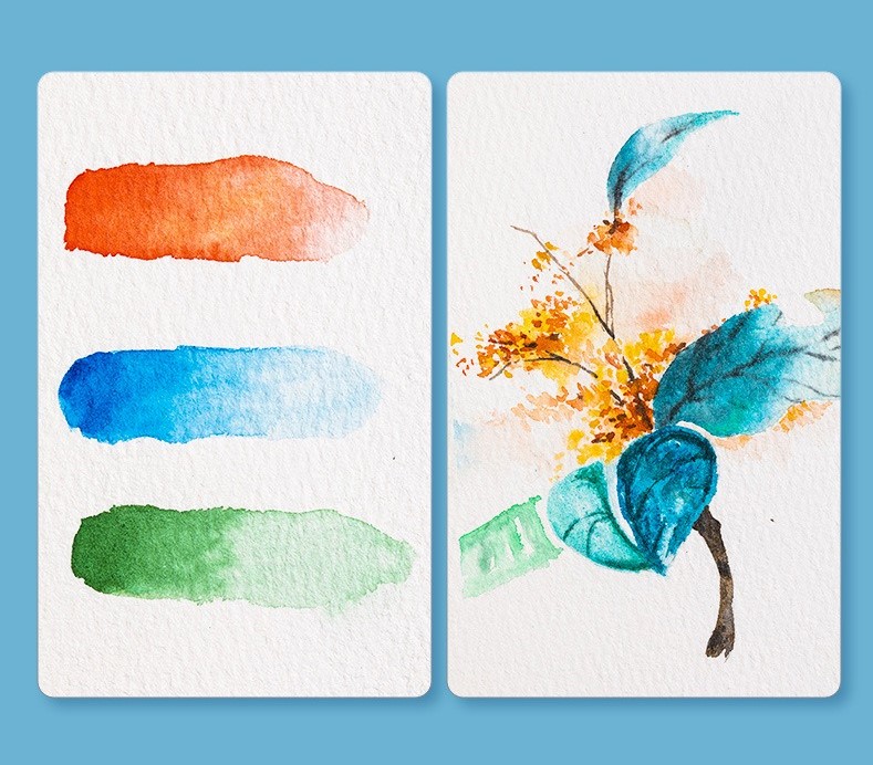 Фактура хорошо выражена. Листы действительно плотные, с ровным краем подойдут для техник по-мокрому. Бумага позволяет создать различных акварельных эффектов, будь то ровные заливки, или градиенты.