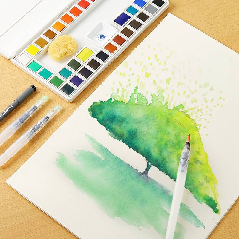 Фактура хорошо выражена. Листы действительно плотные, с ровным краем подойдут для техник по-мокрому. Бумага позволяет создать различных акварельных эффектов, будь то ровные заливки, или градиенты.