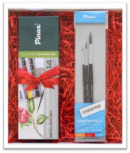 Компания Pinax подготовила серию подарочных наборов, которые станут чудесными готовыми решениями для любого художника. Подарочный набор №3 включает в себя: Набор акварели «Ботаническая палитра» 14 цветов в кюветах в металлическом пенале + кисть №4 Pinax HI-TECH синтетика круглая, набор кистей из синтетики (имитация белки, синтетика производства Японии): используются для акварели как полный аналог беличьих кистей, при этом отличаются лучшими характеристиками (круглые № 1, 3, 5) Набор идеально подойдёт для художников, предпочитающих классическую акварельную живопись.