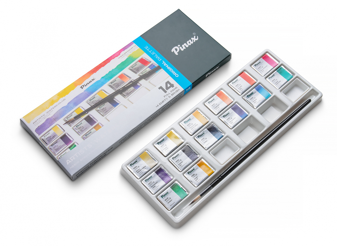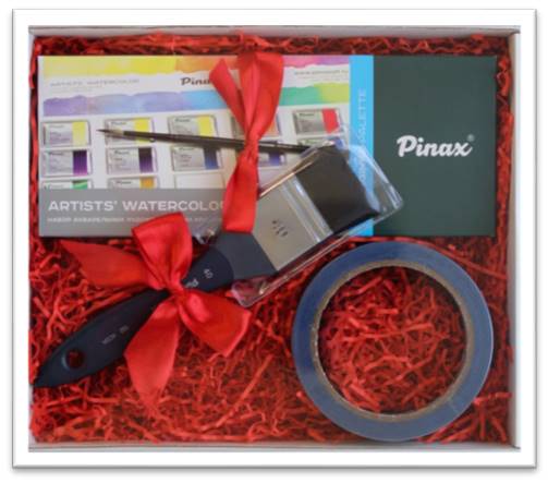 Компания Pinax подготовила серию подарочных наборов, которые станут чудесными готовыми решениями для любого художника. Подарочный набор №4 включает в себя: набор акварели Pinax "Оригинальная палитра" 14 кювет + 4 пустые кюветы и кисть №5 Pinax HI-TECH синтетика круглая, ленту малярную маскирующую 36мм*25 м, а также кисть ФЛЕЙЦ N 40 CREATIVE из чёрной козы (арт.150040). Набор идеально подойдёт для художников, предпочитающих акварельную живопись больших форм.