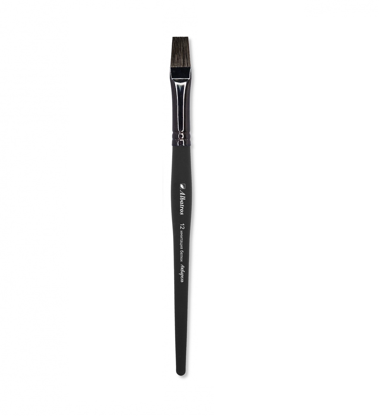 Кисть "Акварель", имитация белки, плоская, по своим характеристикам близка к кистям из натурального ворса белки. Пучок кисти обладает плоской формой. Рабочая часть закреплена цельнометаллической обоймой на короткой деревянной ручке покрытой черной эмалью. Кисти удобны для отмывок и создания фона.
