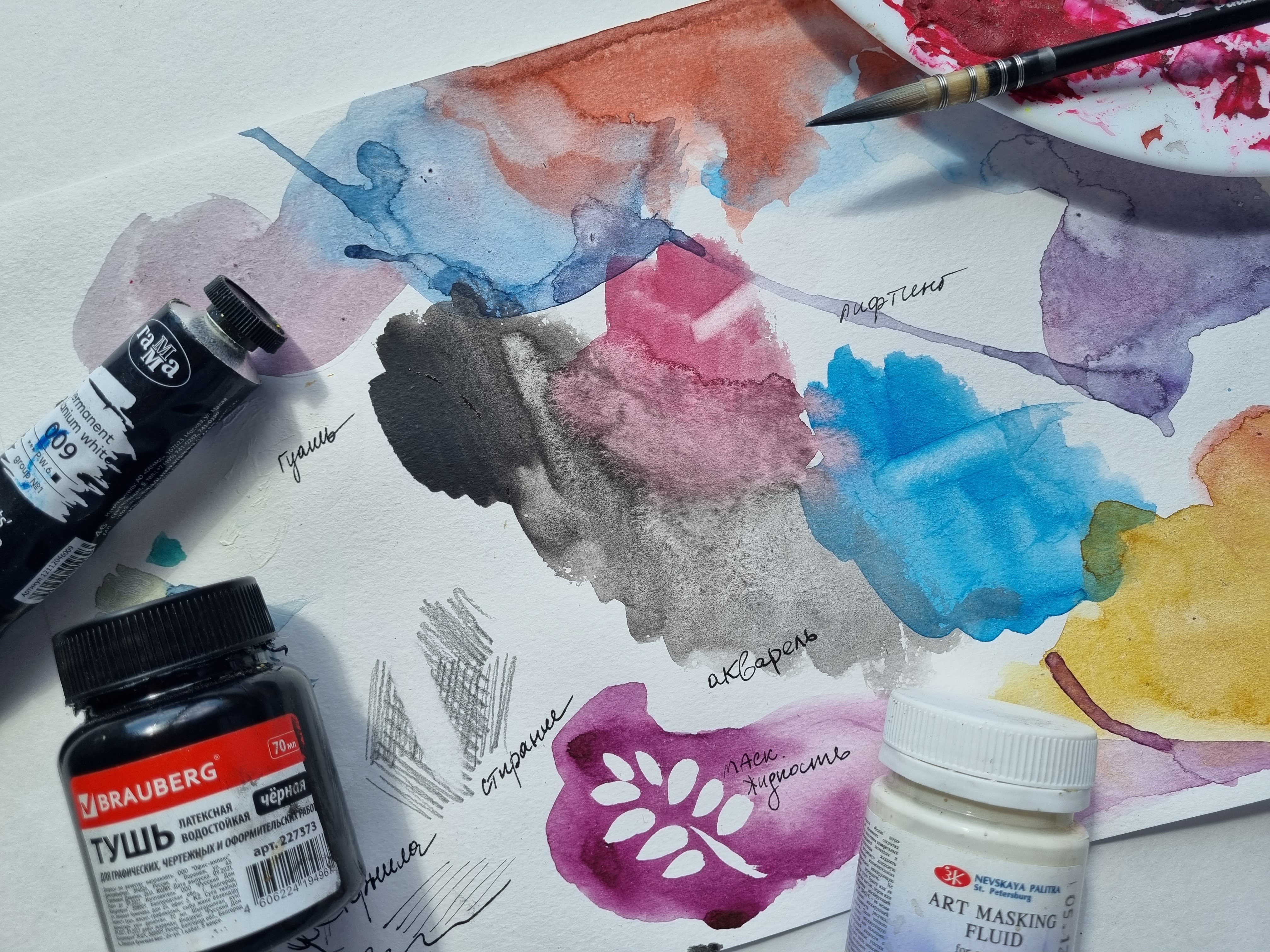 При нанесении разведённой краски видно, что краска словно проскальзывает по бумаге, словно не желая впитываться в бумагу, её надлежит вести.