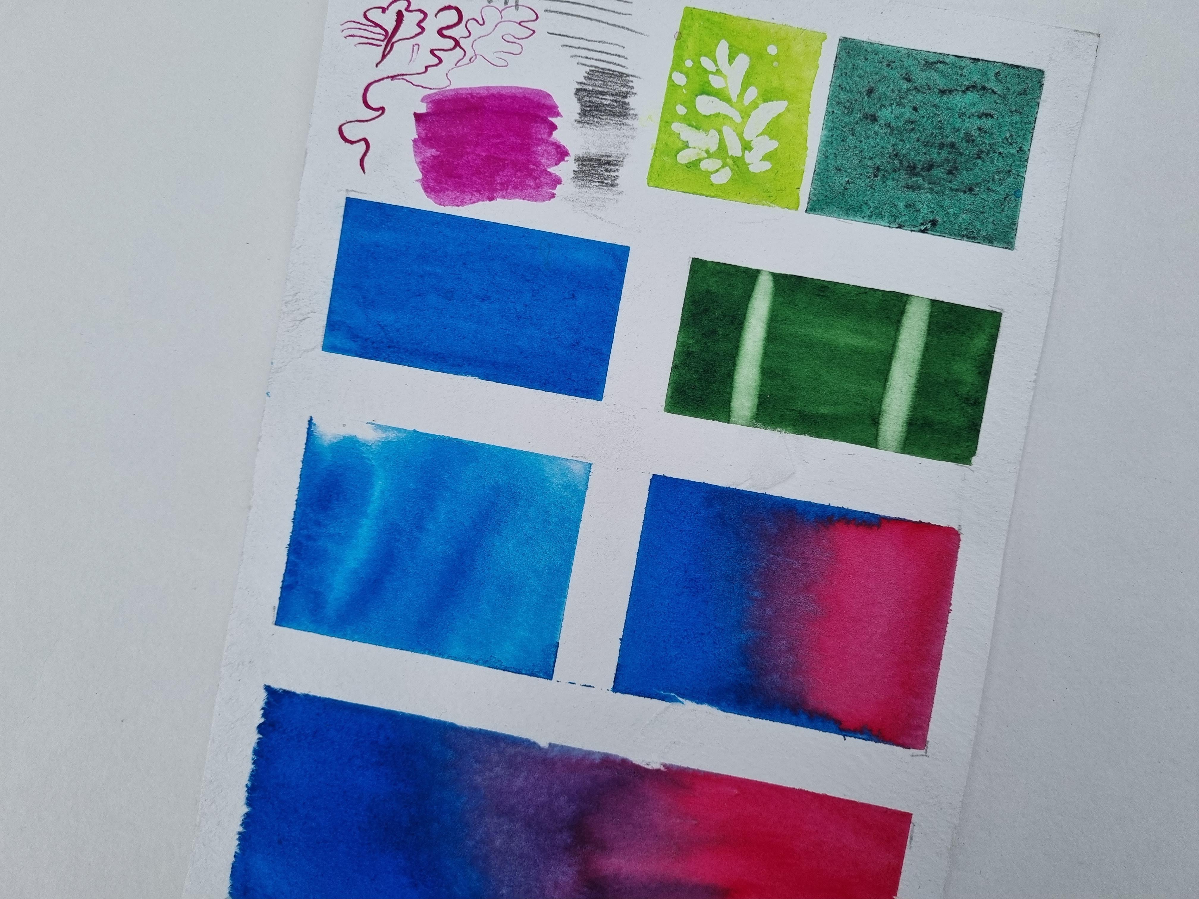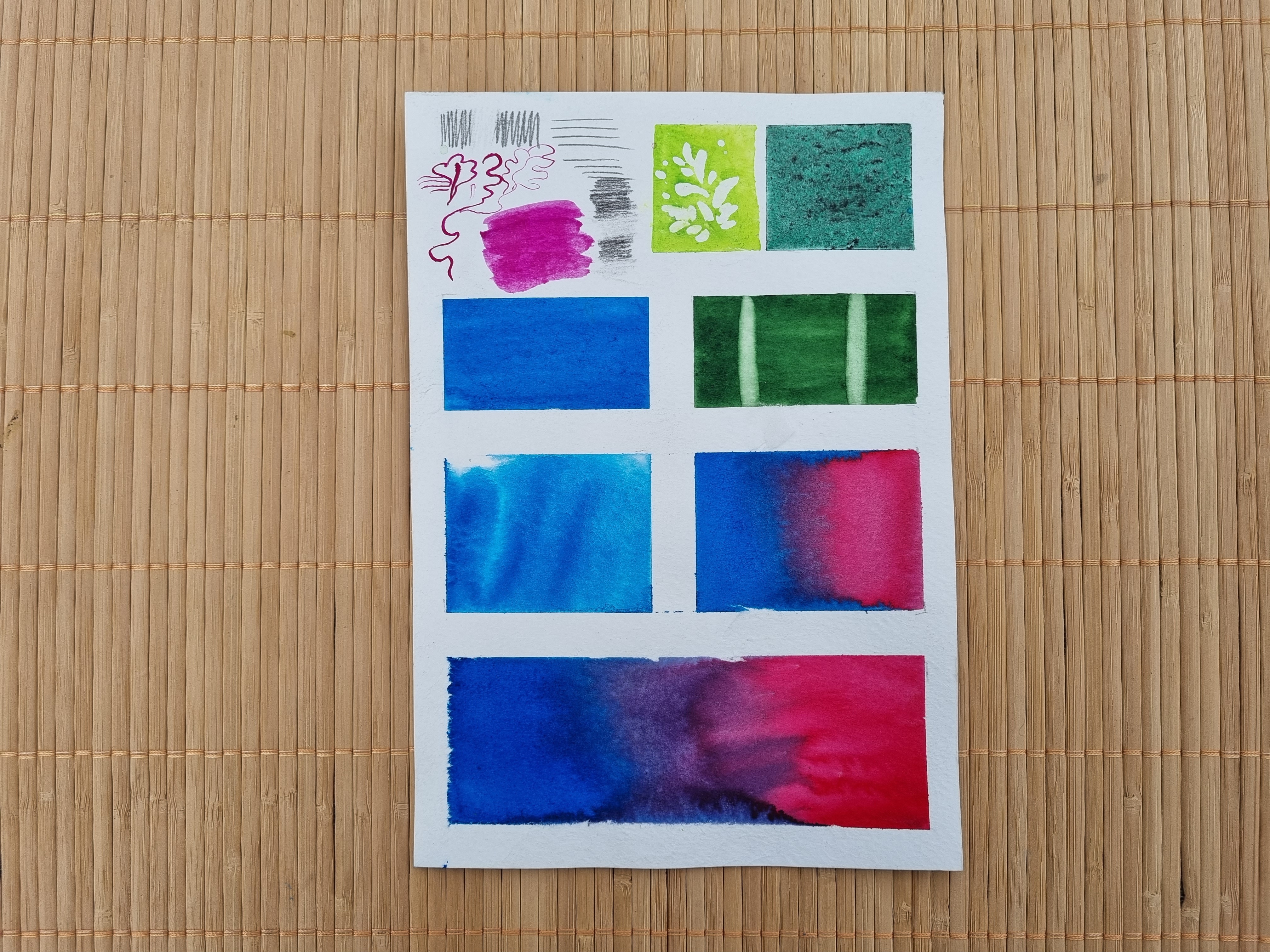 При смачивании бумага ощутимо приподнимается, что может повлиять на качество заливки. Растекание краски довольно пассивное. Влага впитывается быстро. Градиент «ведёт» также как и краску, которая преимущественно остаётся на поверхности листа. Есть ощущения «скатывания».