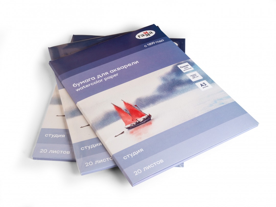 В папке «ГАММА» серии «Студия» используется бумага Гознак, подходящая для акварели. Листы изготовлены из 100% целлюлозы, плотностью 200г/м2.