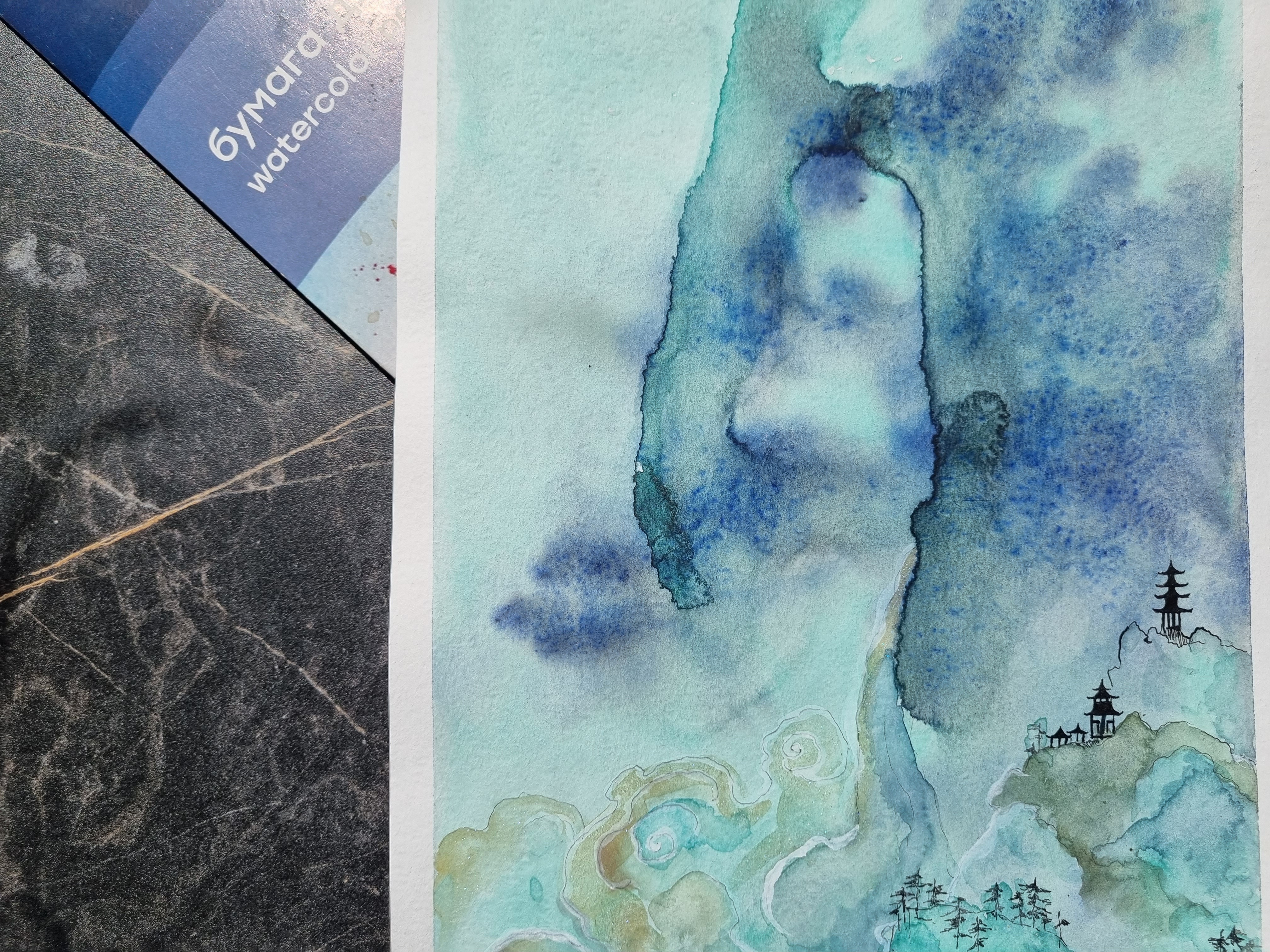Стресс-заливка подразумевала под собой чрезмерное заливание водой, бесконтрольное и неравномерное заполнение пигментом. Лист был зафиксирован скотчем на стекле, т.е. на тяжёлой и абсолютно гладкой поверхности.