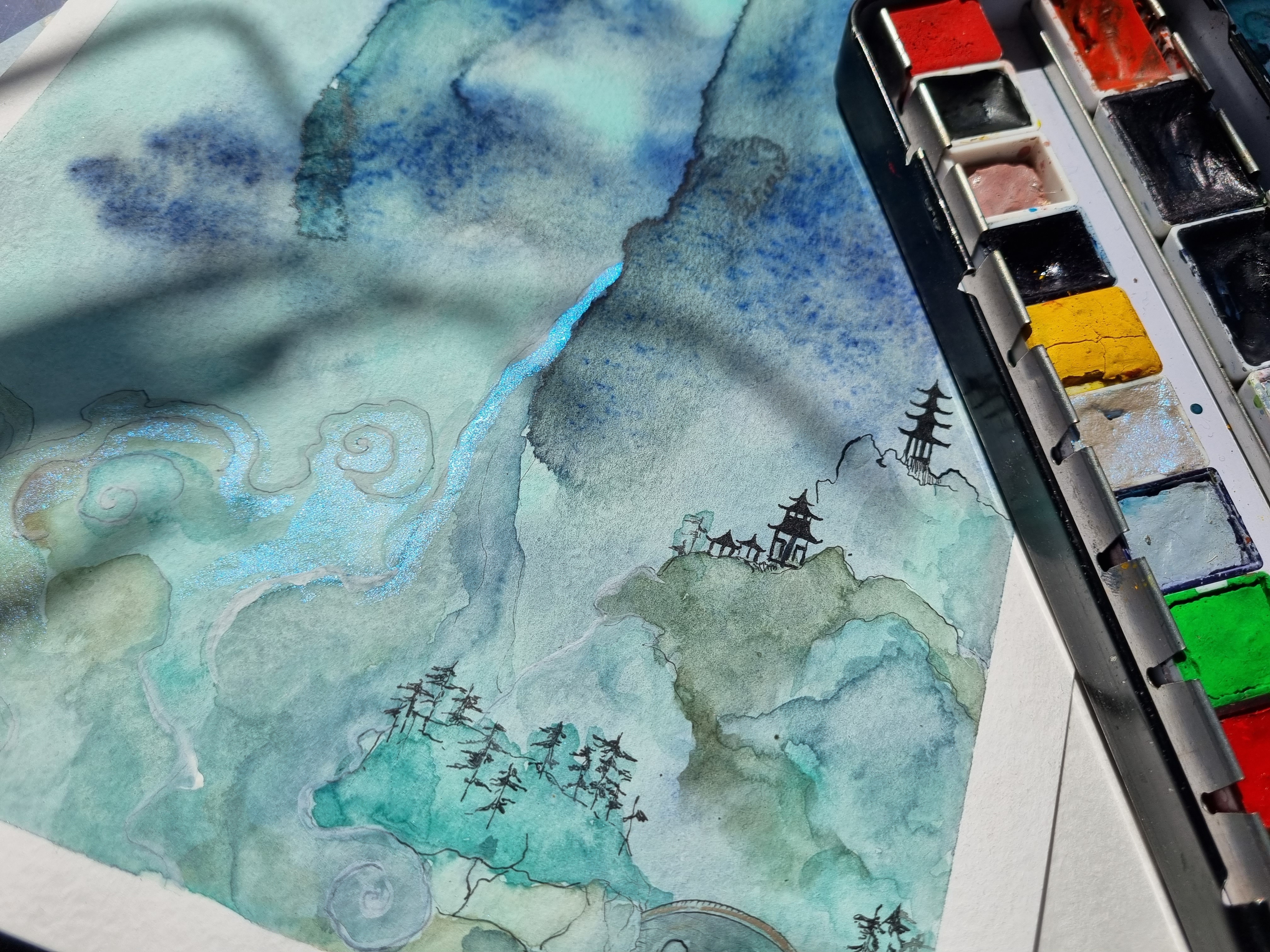 При работе мокрым-по-мокрому, дабы смочить бумагу равномерно следует применить довольно много влаги и лучше применить фиксацию. При смачивании бумага приподнимается.