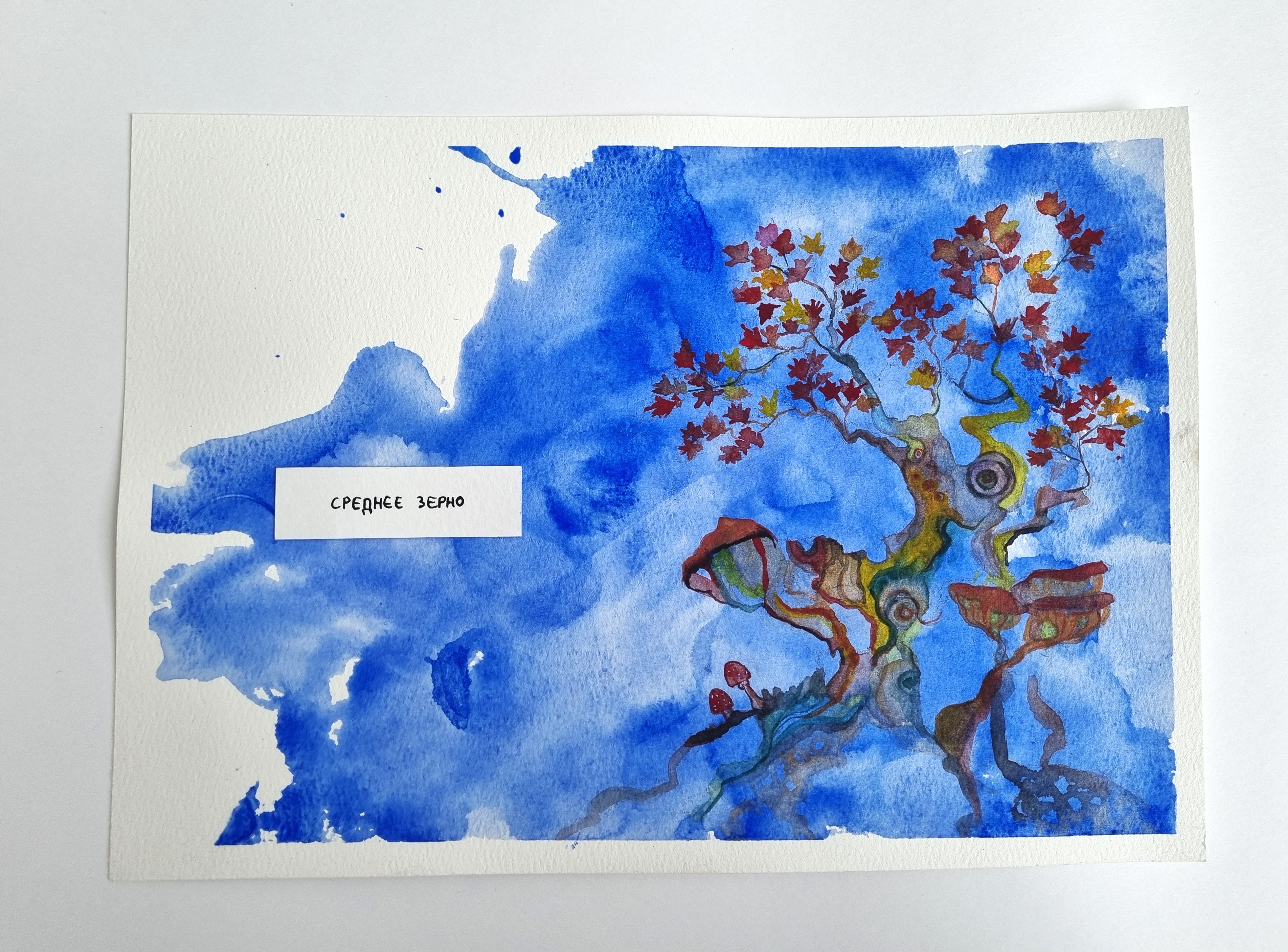 Распадение пигмента одного из цветов красиво подчёркивается фактурой в большей степени, чем при применении меньшего количества воды.
