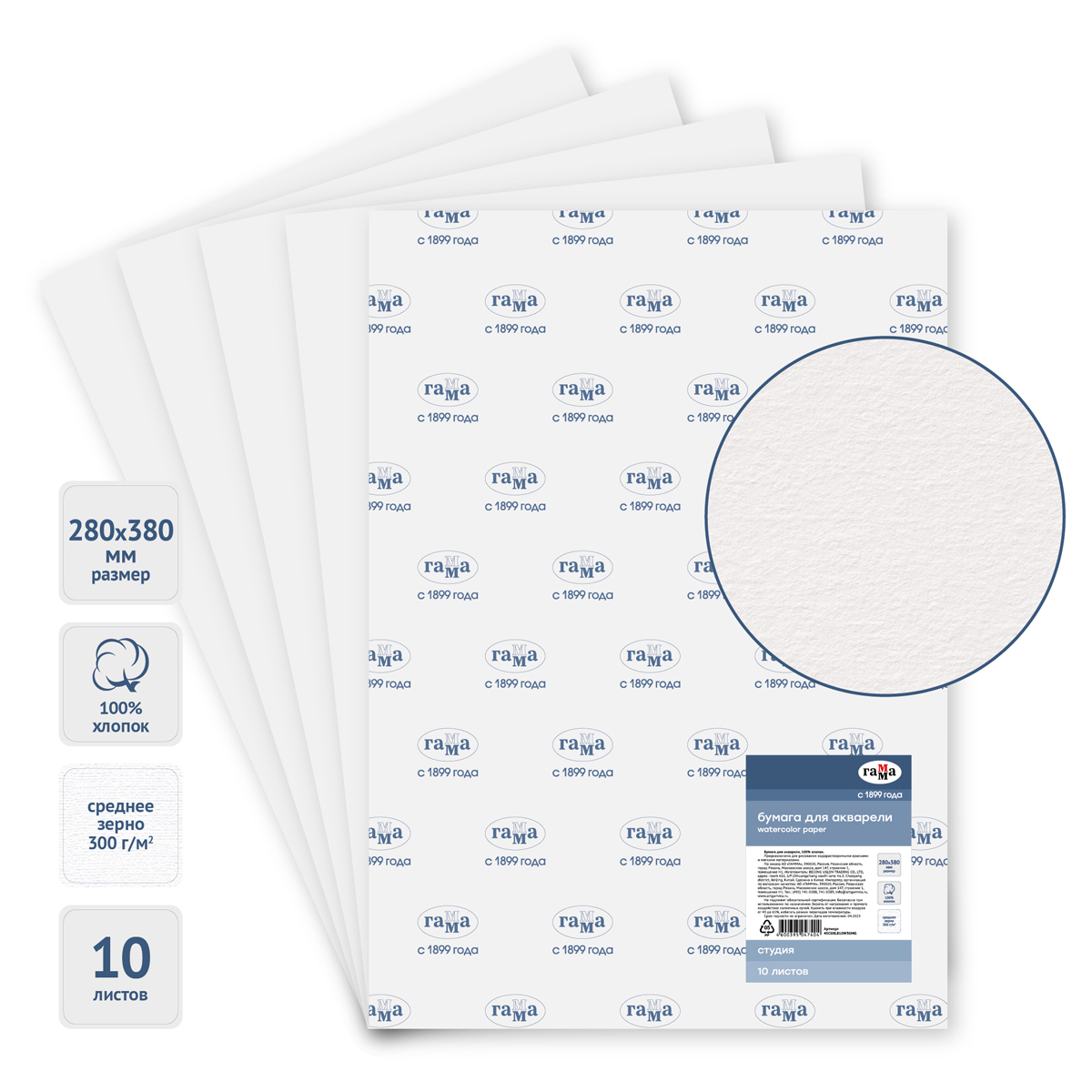 Бумага для акварели «ГАММА» серии «Студия» состоит из 100% хлопка. Высокая плотность 300 г/м2 выдерживает больше воды и позволяет наносить больше краски. Среднезернистая фактура предназначена и для влажных техник, и для детальных прорисовок. Она является достаточно универсальной.