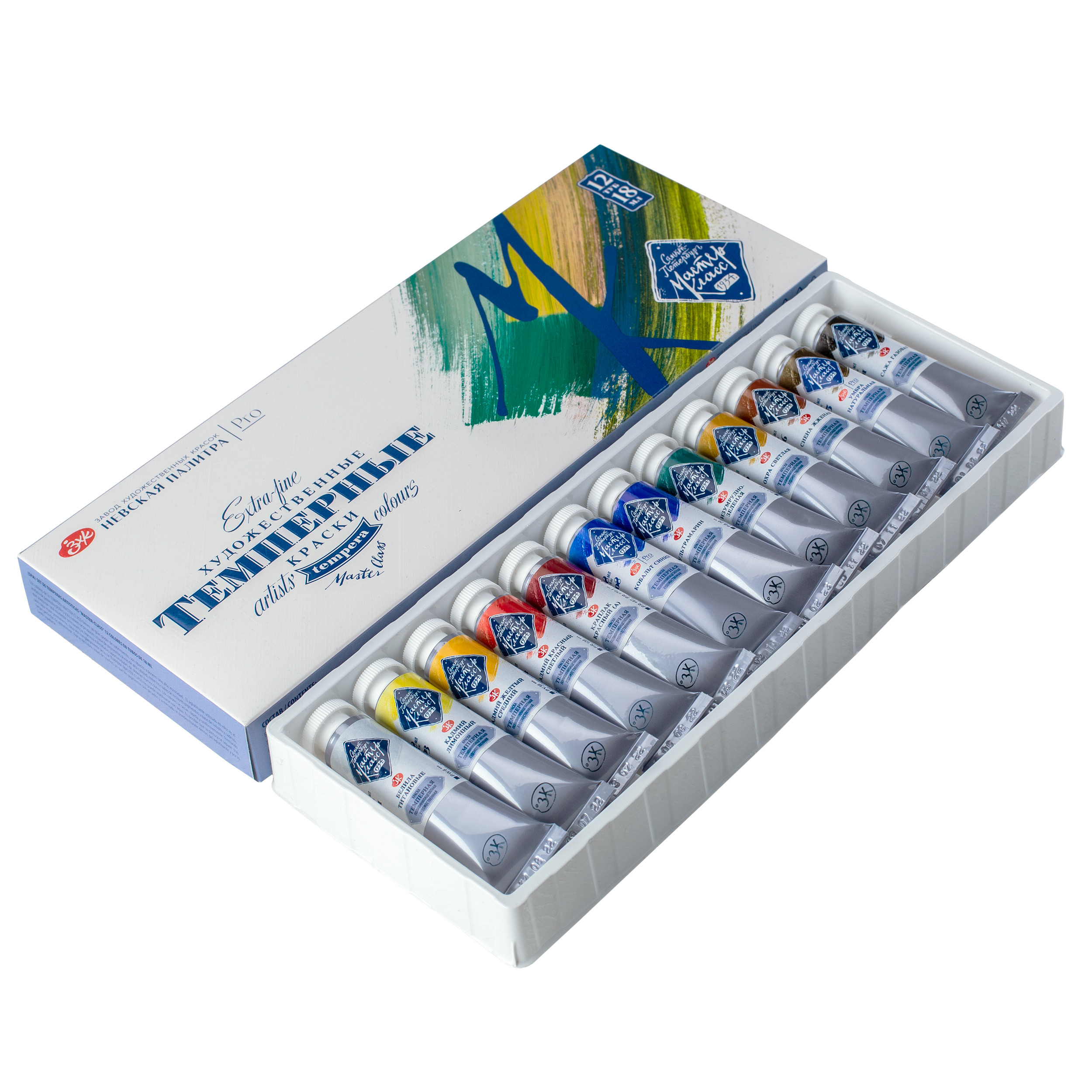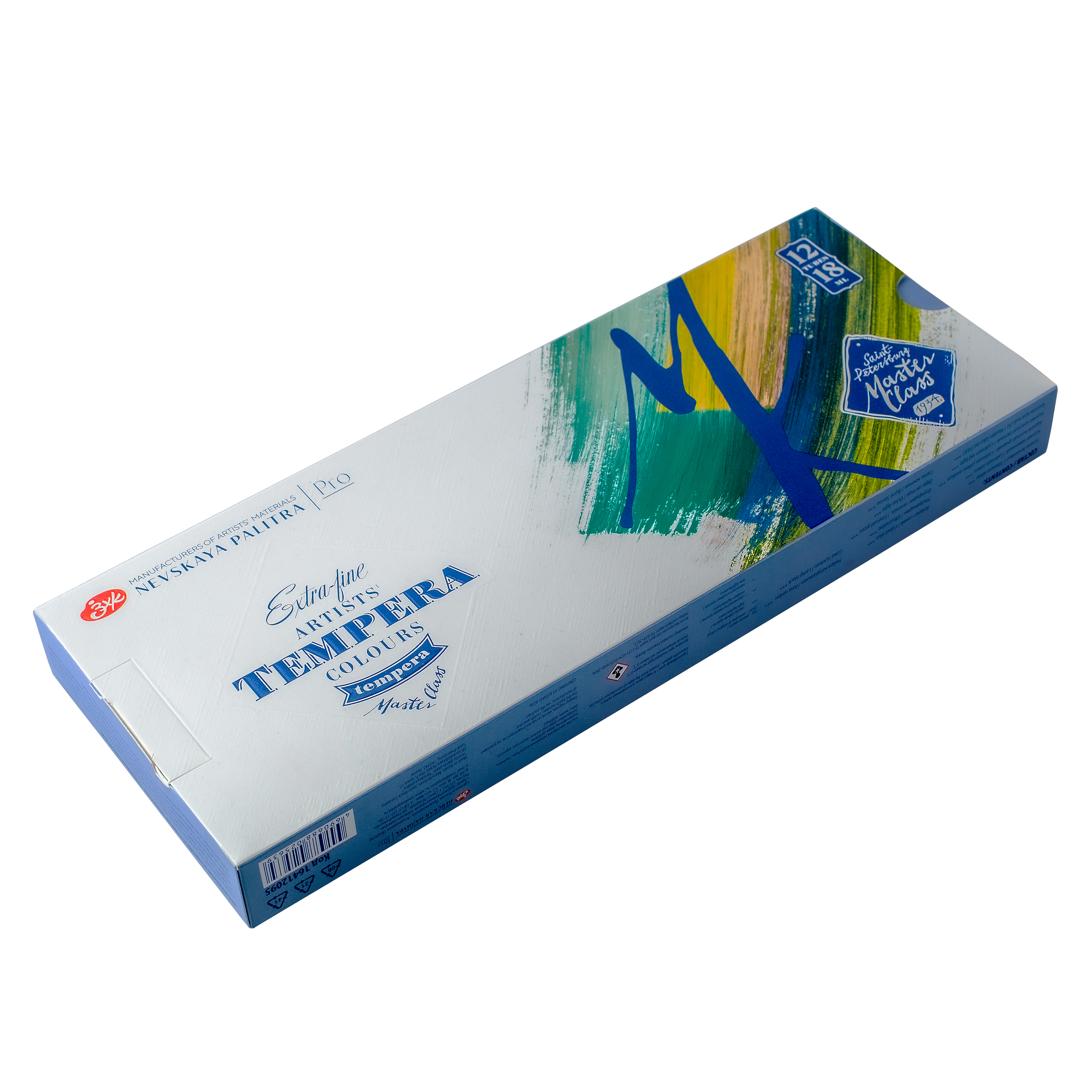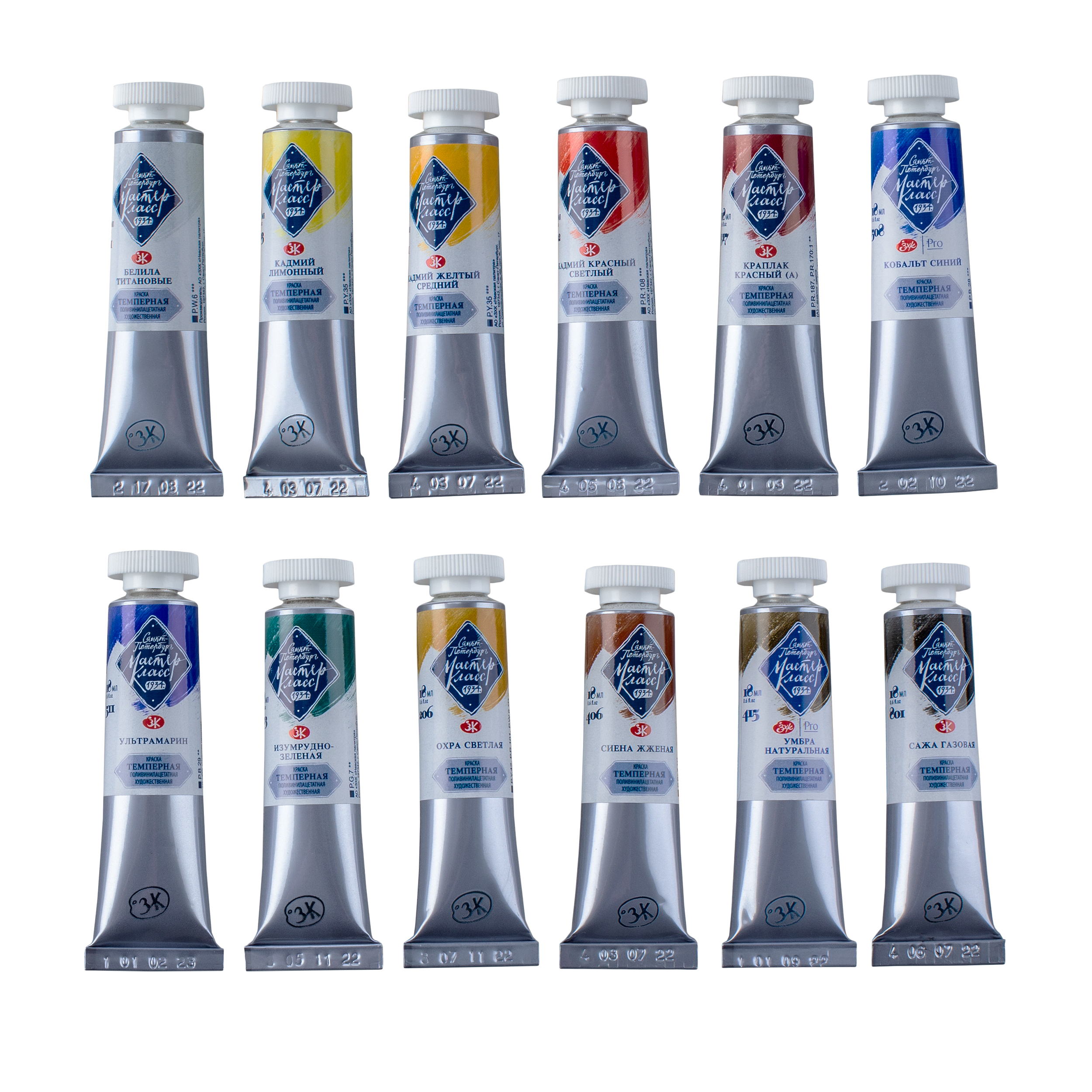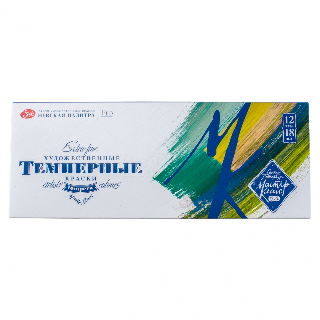 Художественные темперные поливинилацетатные краски «Мастер-Класс» изготавливаются на основе органических и неорганических пигментов и поливинилацетатной дисперсии и являются традиционным материалом для живописи. Благодаря тщательно подобранным компонентам темперные краски прекрасно подходят для живописных и декоративно-оформительских работ. Большинство цветов в палитре монопигментные и обладают высочайшим показателем светостойкости. Все краски выкопигментированные, яркие и чистые. Темпера «Мастер-Класс» позволяет получить многообразие благородных оттенков в разбелах и смесях. Краски легко наносятся на бумагу, картон, дерево, керамику, грунтованный и негрунтованный холст. При высыхании образуют эластичную, непрозрачную, несмываемую пленку. Сбалансированная палитра из 12 цветов в наборе «Мастер-Класс» позволяет решить множество творческих задач художника.