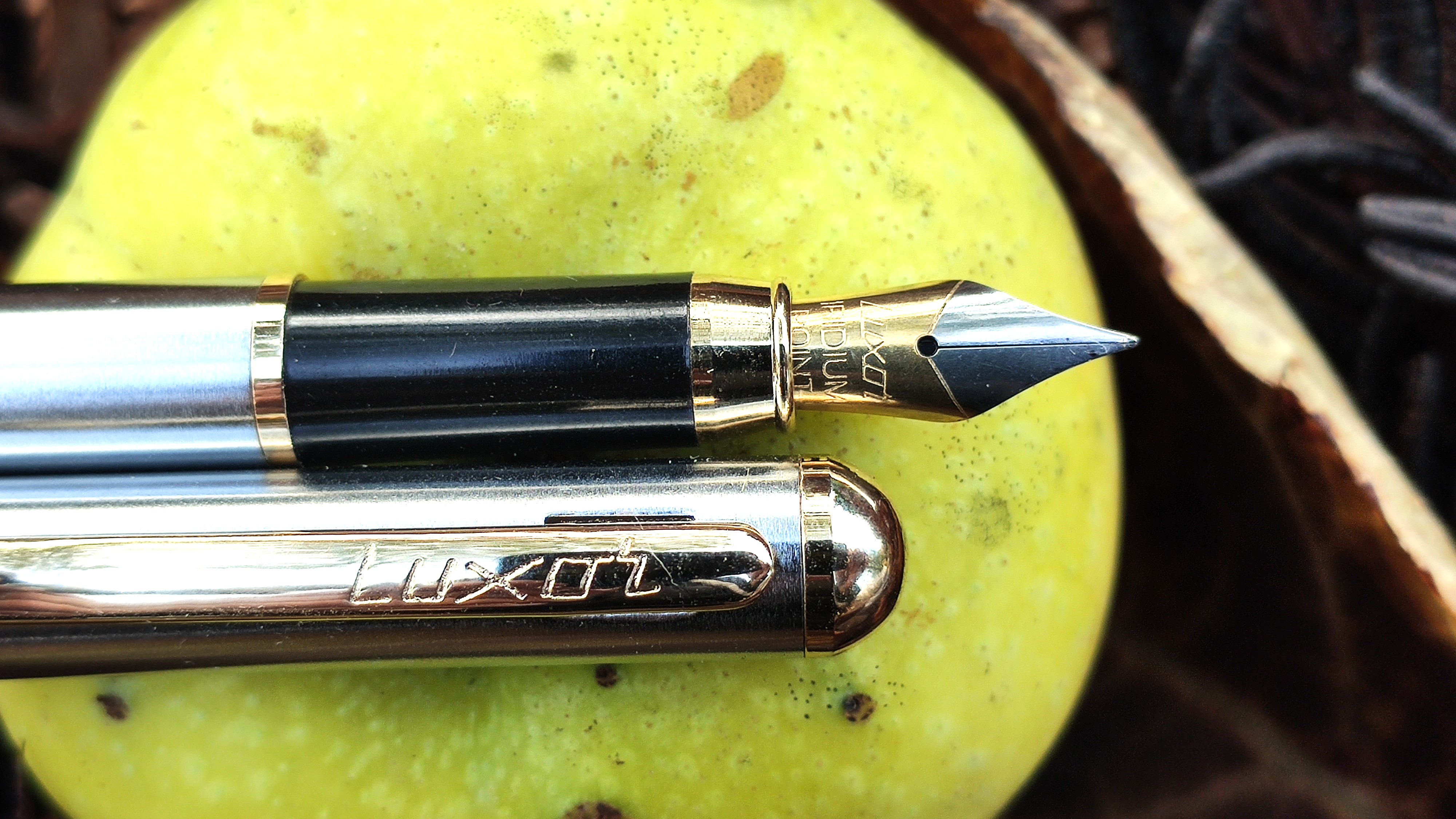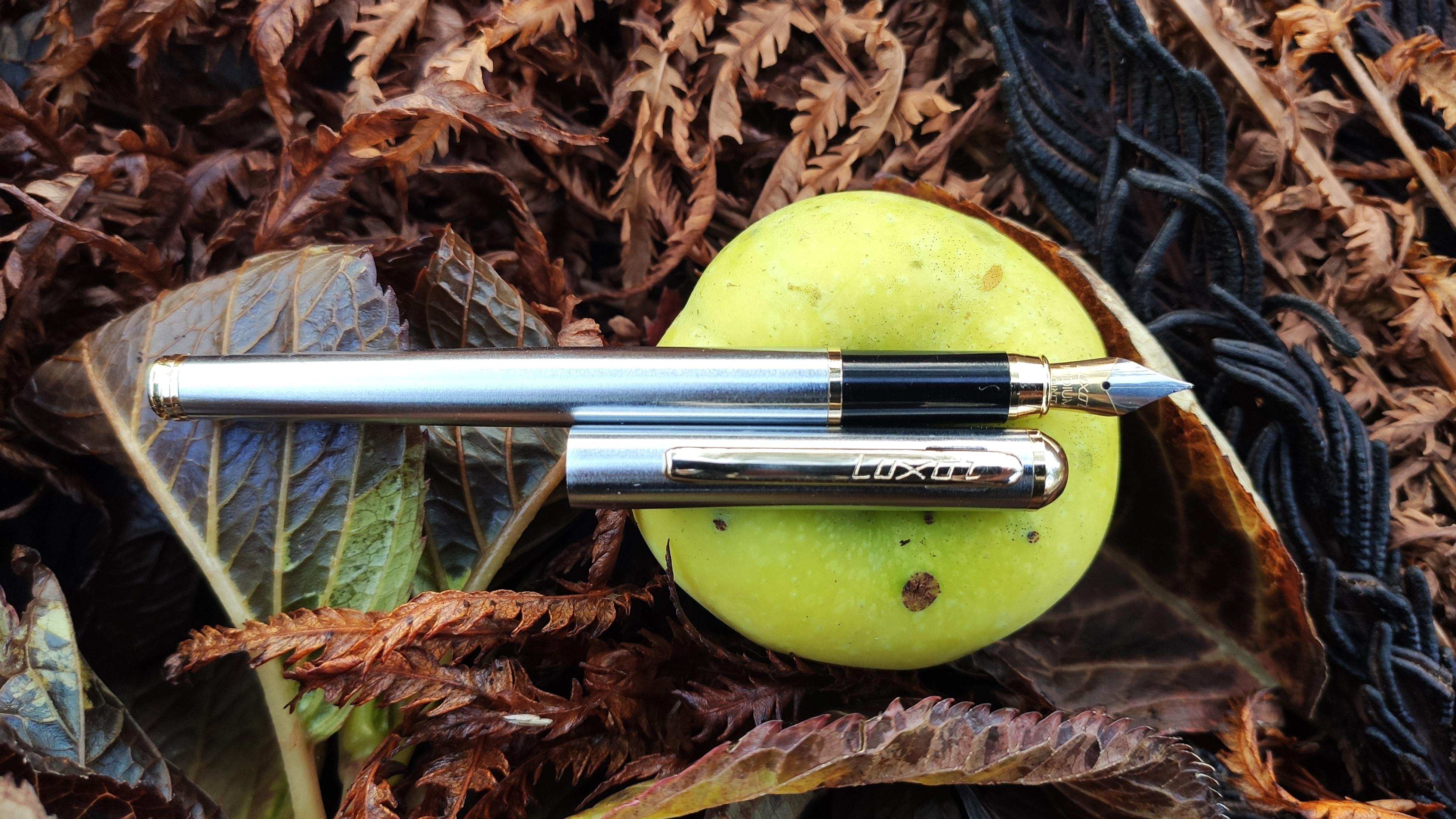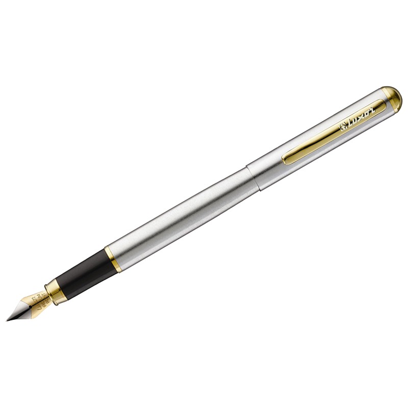 Представительская перьевая ручка Luxor "Marvel" в металлическом корпусе с хромированным матовым покрытием и золотыми элементами корпуса.