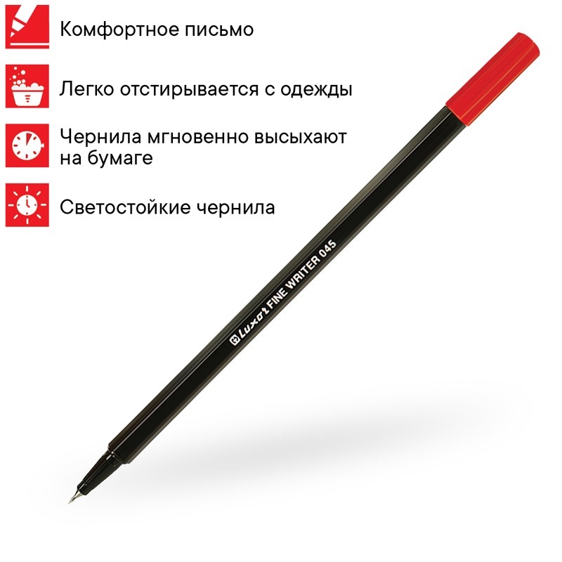 Особенность капиллярных ручек Luxor – это умение подстраиваться под силу нажима, из-за чего напряжение на руку при письме не ощущается. Изделия пишут тонкой равномерной линией, оставляя контрастный след. Наконечник изготавливается из твёрдого пластика, благодаря чему обеспечивается одинаковая толщина линий при разных наклонах ручки.